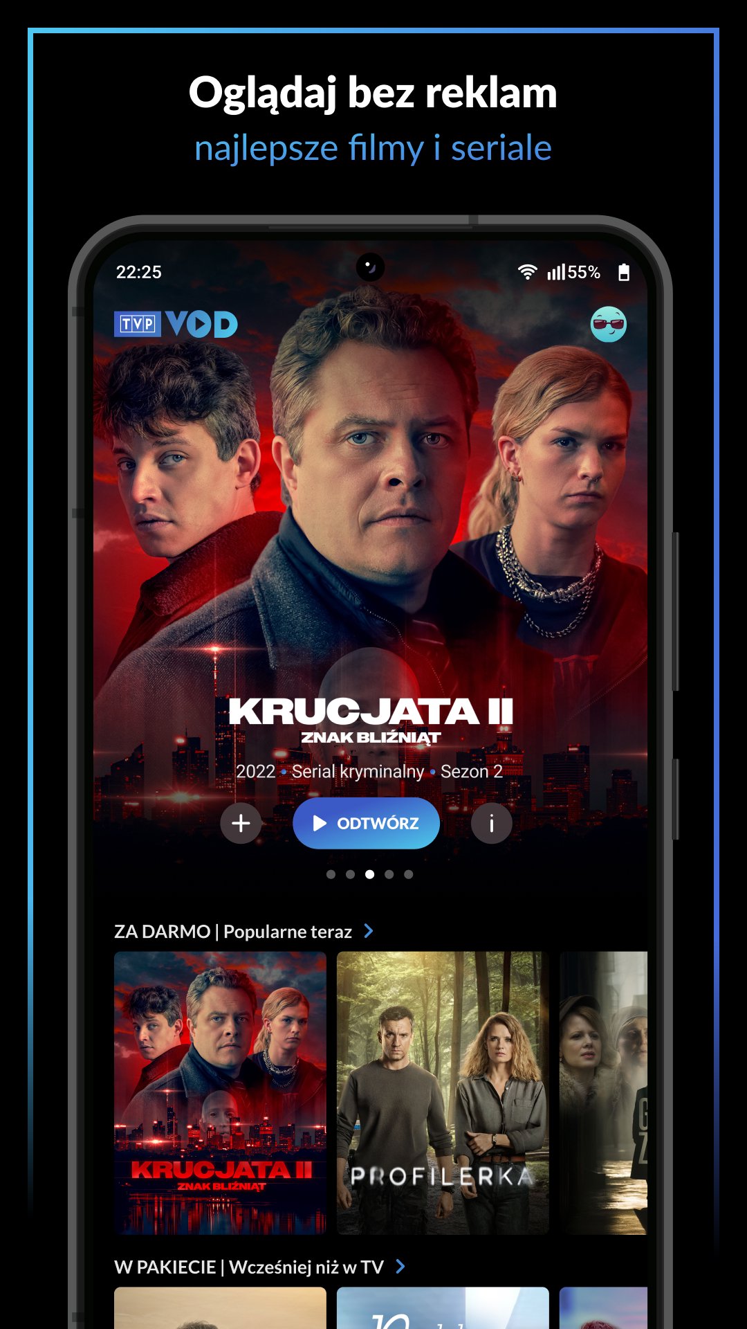 The TVP VOD online streaming service of films and series also includes original productions, unavailable anywhere else, starring the most popular Polish actors. It also offers pre-premiere access to Polish series loved by millions of viewers online! As well as Oscar-winning productions, Television Theater performances, hit foreign series, award-winning documentaries and top-class entertainment.