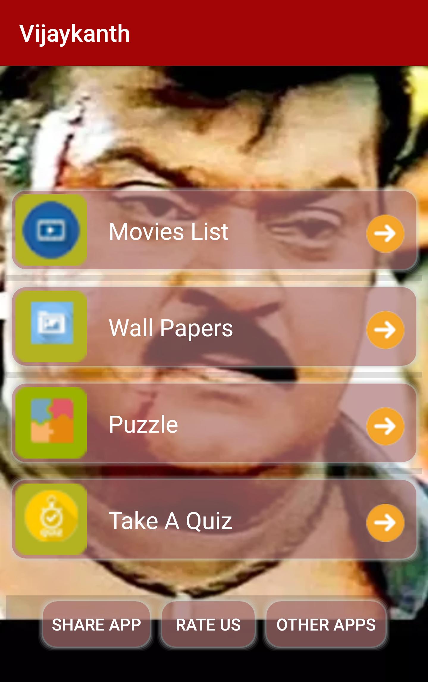 This Application displays the information of Vijayakanth movies, it will not play any video or audio of his movies, it is a multipurpose application to Vijayakanth fans, and App contains four options.