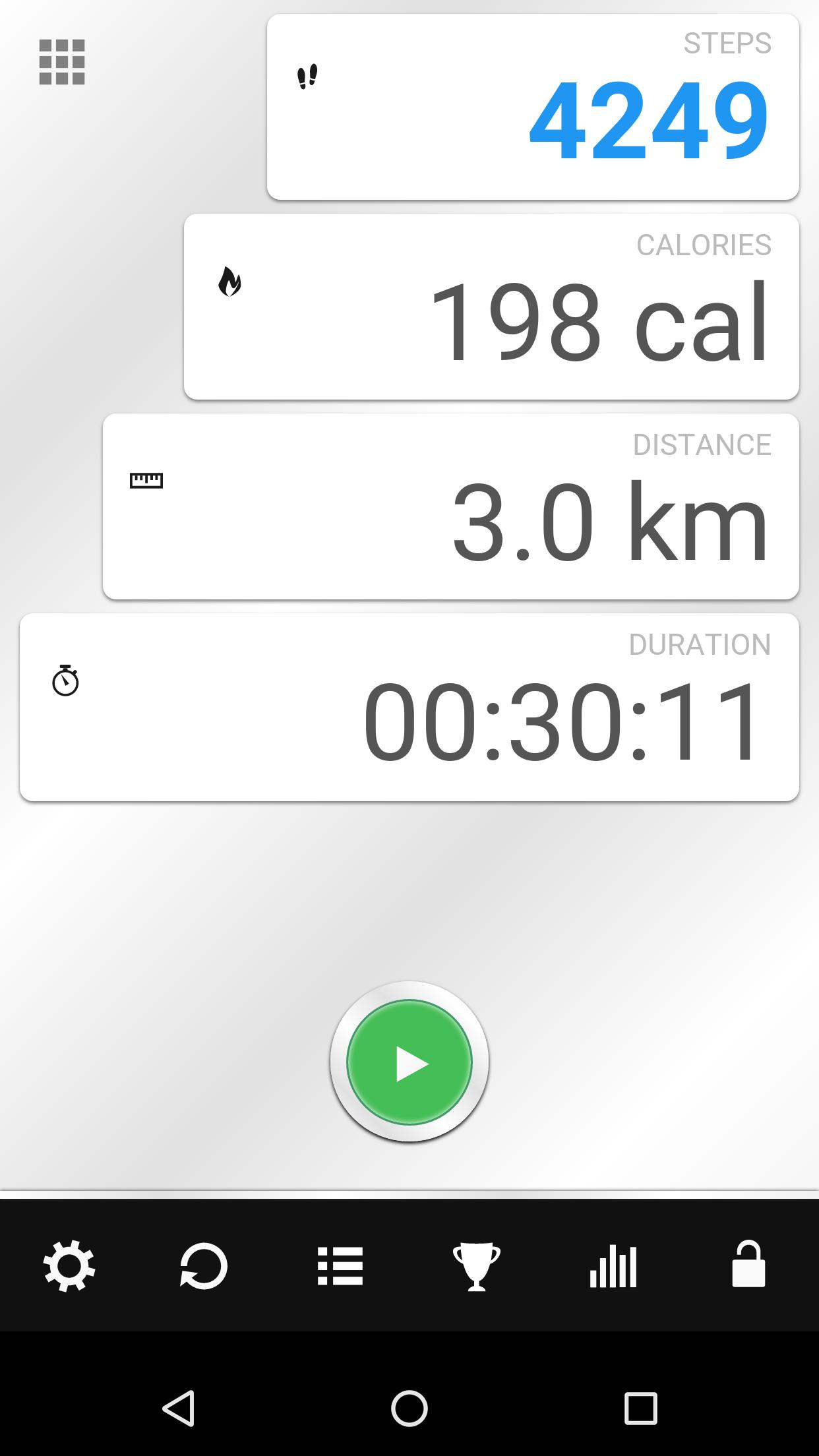 View graphs displaying the number of steps, calories burned, time, distance by touching on each icon respectively.