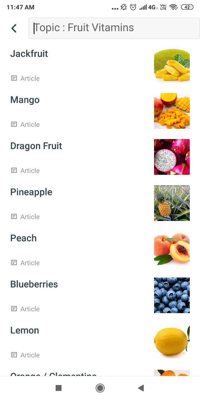Fruits Vegetables Vitamins is an App that provides details of various vitamins, minerals and more information. You can find details about list of fruits, vegetables vitamins such as Vitamin A, Vitamin B, vitamin C, vitamin K, vitamin D, Vitamin E. You can see the Nutritional facts of each fruits and vegetables like calories, water, protein, Carbs, Sugar, Fiber, Fat, vitamins.