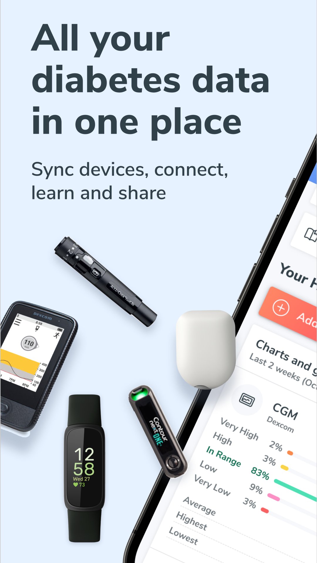 • Sync data from BGMs, insulin pumps and pens, and CGMs.