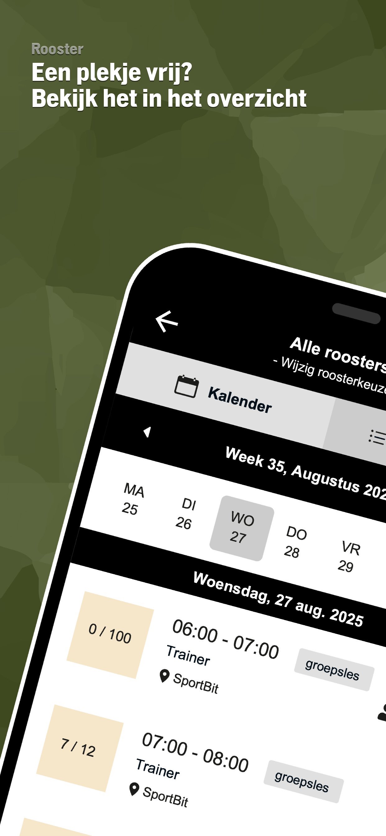 Stel een rooster op met iedere week terugkerende lesmomenten. Uw leden zien deze lesmomenten in het weekoverzicht terug tot 4 weken vooruit, waarvoor zij zich aan kunnen melden.