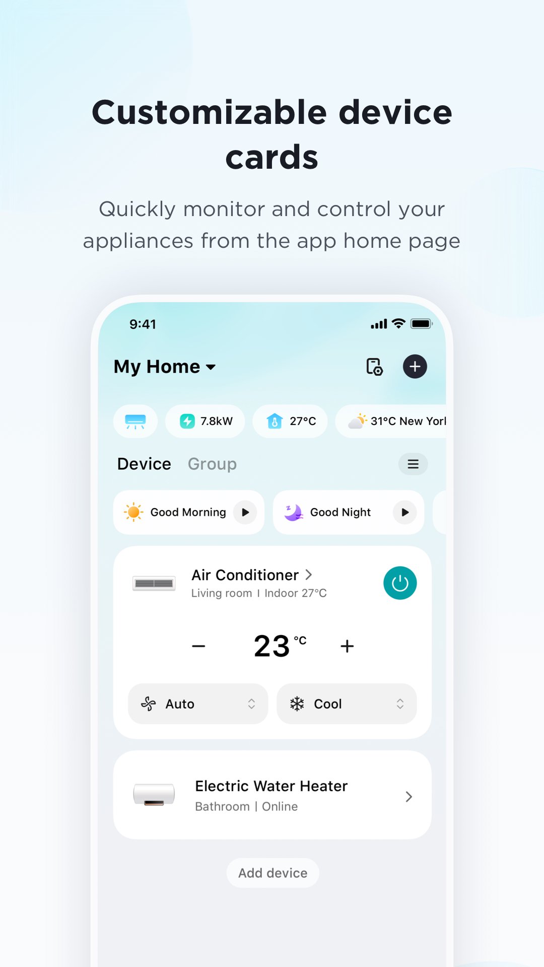 CUSTOMIZABLE DEVICE CARDS: Quick access to your most used devices and controls from the app home page.