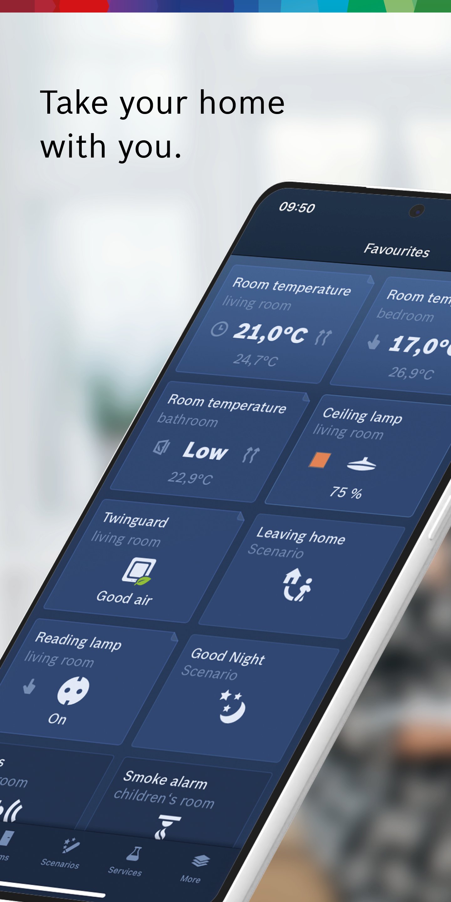 The new ease of living. The Bosch Smart Home app and smart devices from Bosch Smart Home and partners make your home more comfortable, more secure and more energy-efficient. Furthermore, your personal details will only be stored locally for you. Enjoy intuitive operation, a modern design and the reassuring feeling that you are in control. Welcome home!