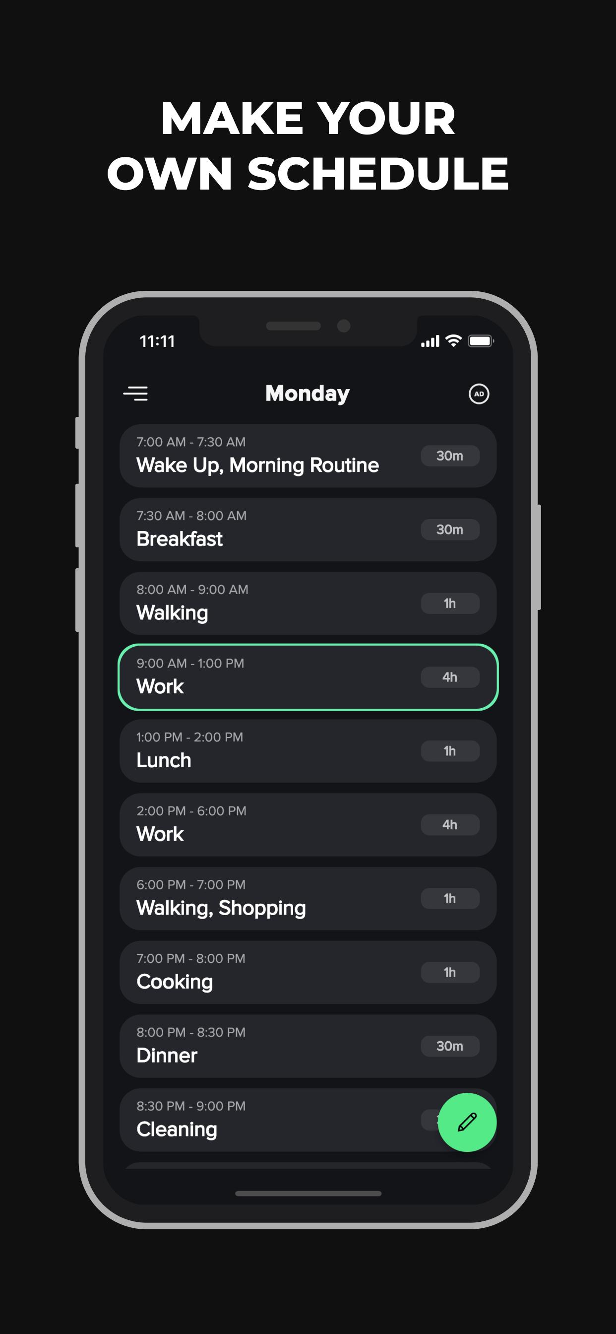 Using this daily schedule planner app, you can create a task list for every day of the week, for every hour and minute of the day. Thus, build new habits or get rid of bad habits or even solve everyday tasks using the time blocking technique. (Time blocking is a time management method that asks you to divide your day into blocks of time. Each block is dedicated to accomplishing a specific task, or group of tasks, and only those specific tasks.)