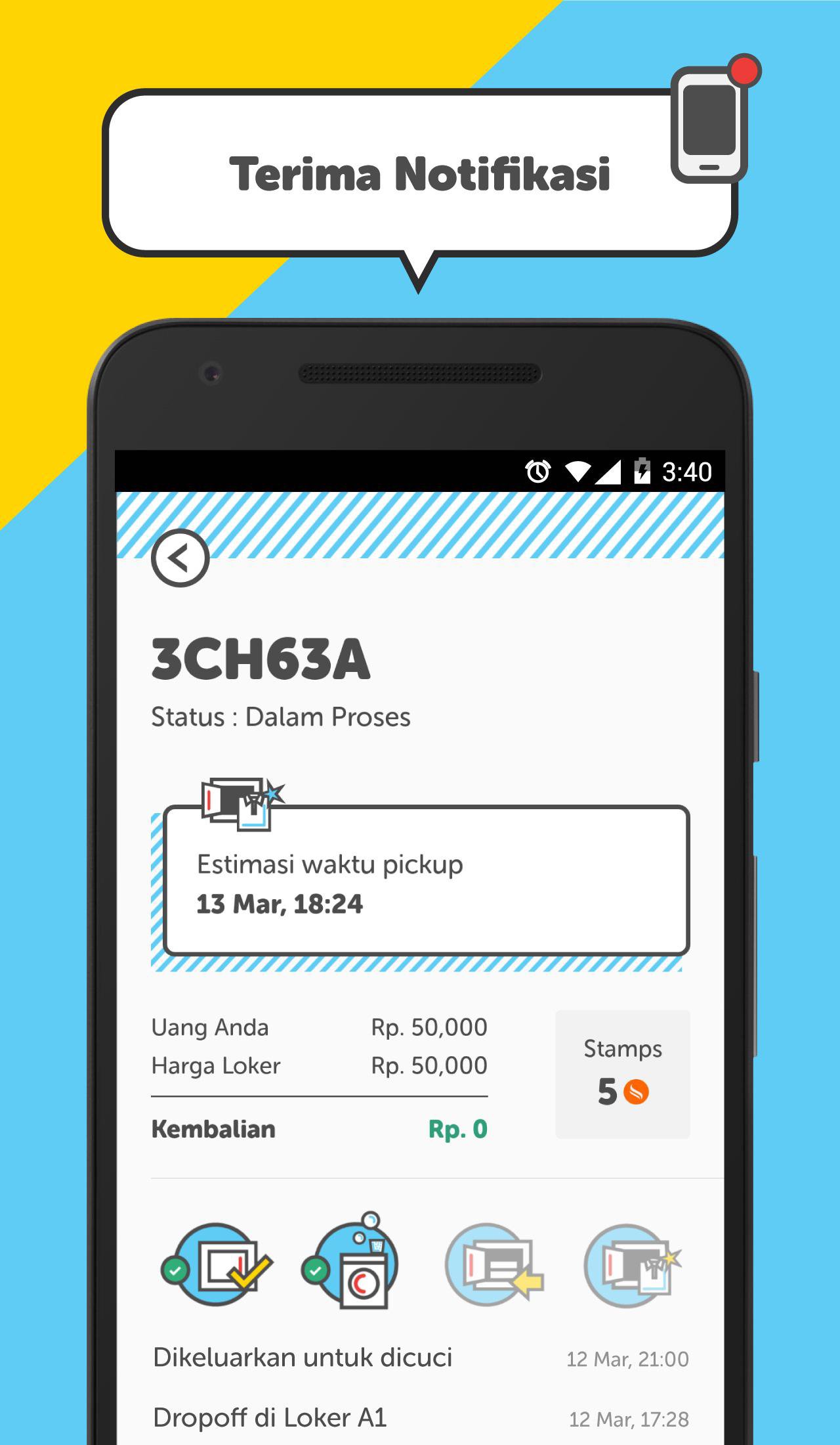 Melalui app ini, Anda bisa melacak proses laundry secara real-time dan menerima PIN melalui notifikasi saat laundry siap diambil.