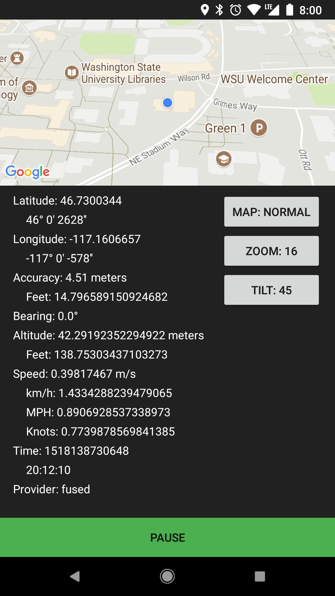 GPS Scanner is a simple demonstration app that outputs your current location information on the screen for you. Details include your latitude, longitude, and speed (among others). Simple map controls and pause functionality are included.