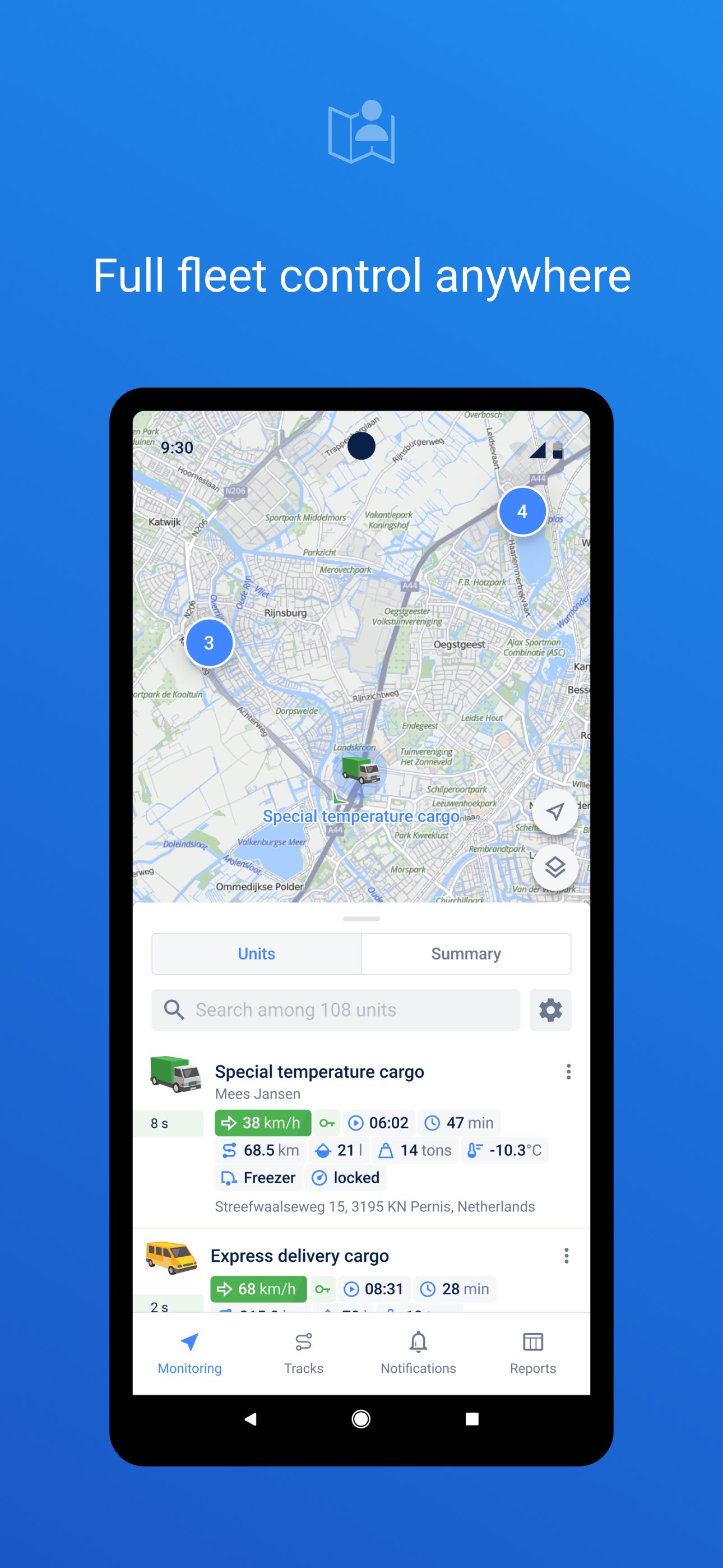 - Unit list control. Monitor movement and ignition state, unit location, and other fleet data in real time.