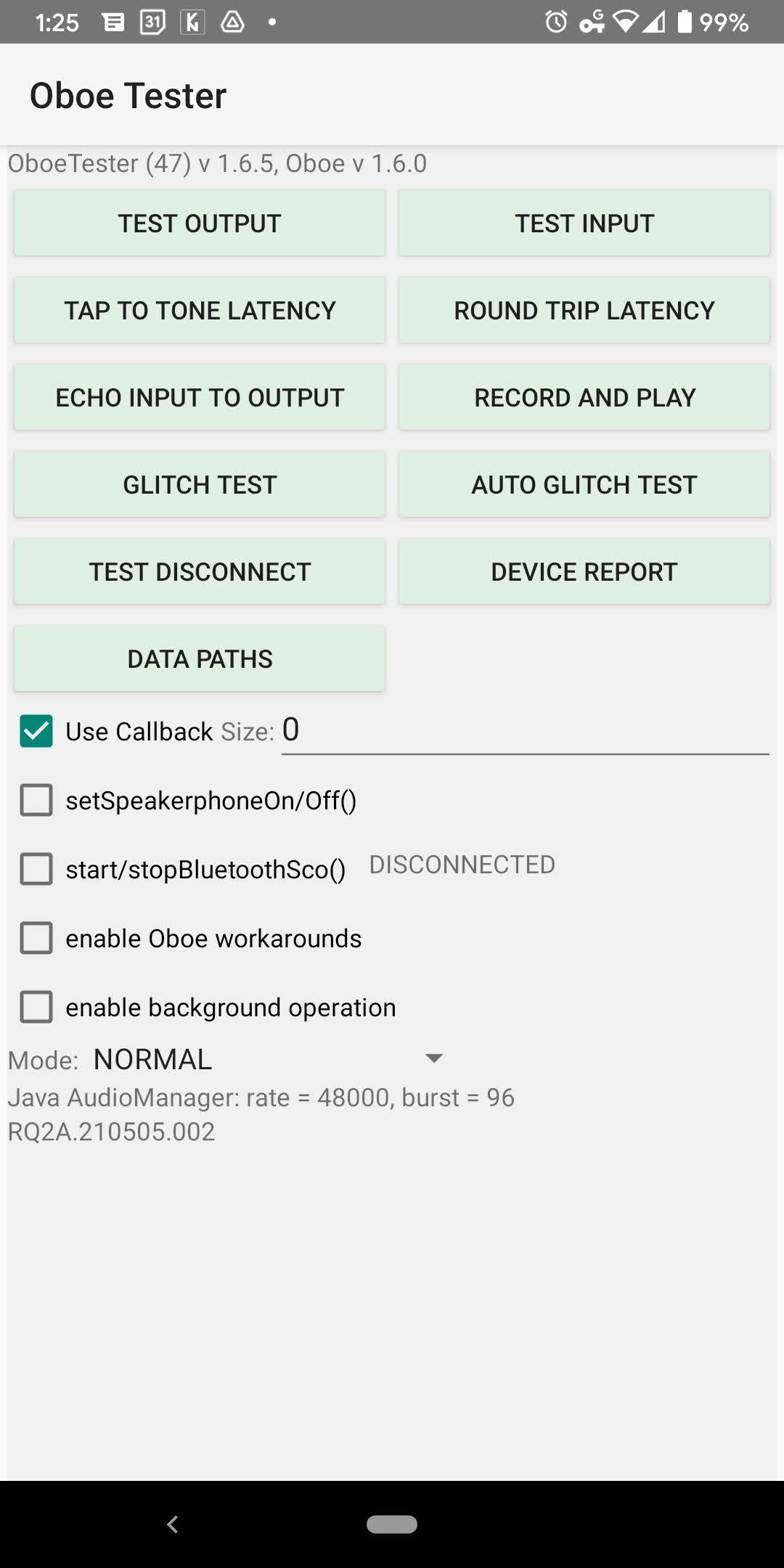 This app can test audio input or output with a variety of settings. It is designed for Android developers or device manufacturers.