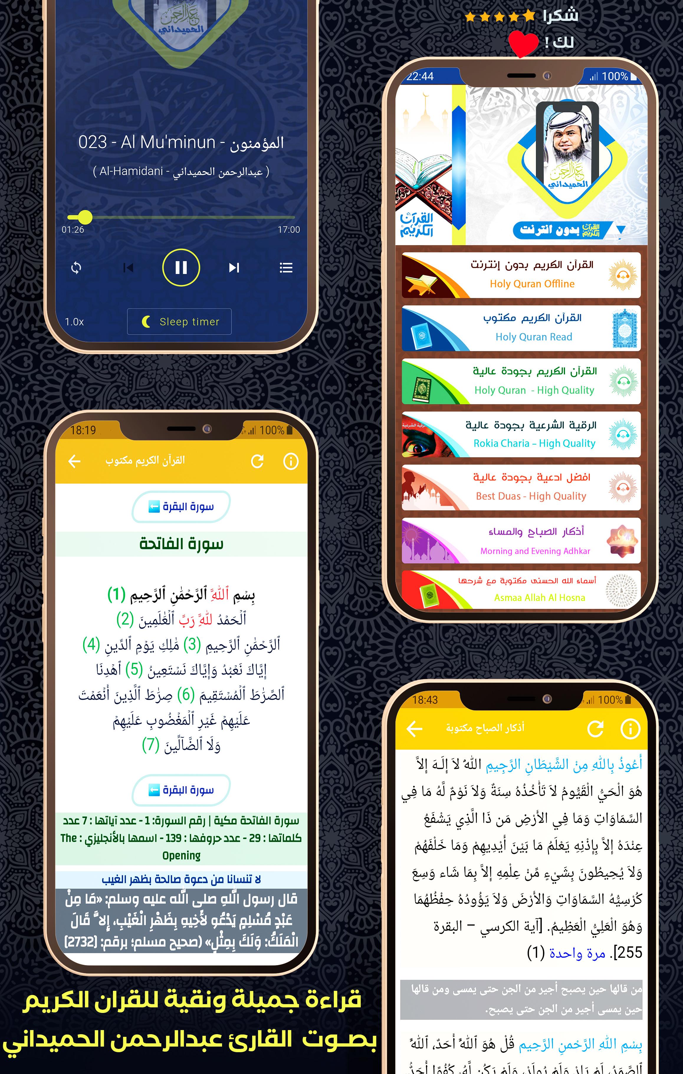⯈ You can use this application with ease and also read and listen to the surahs of the Noble Qur’an, enjoying the voice of the reciter Abdul rahman Al Hamidani, who is one of the most famous reciters
