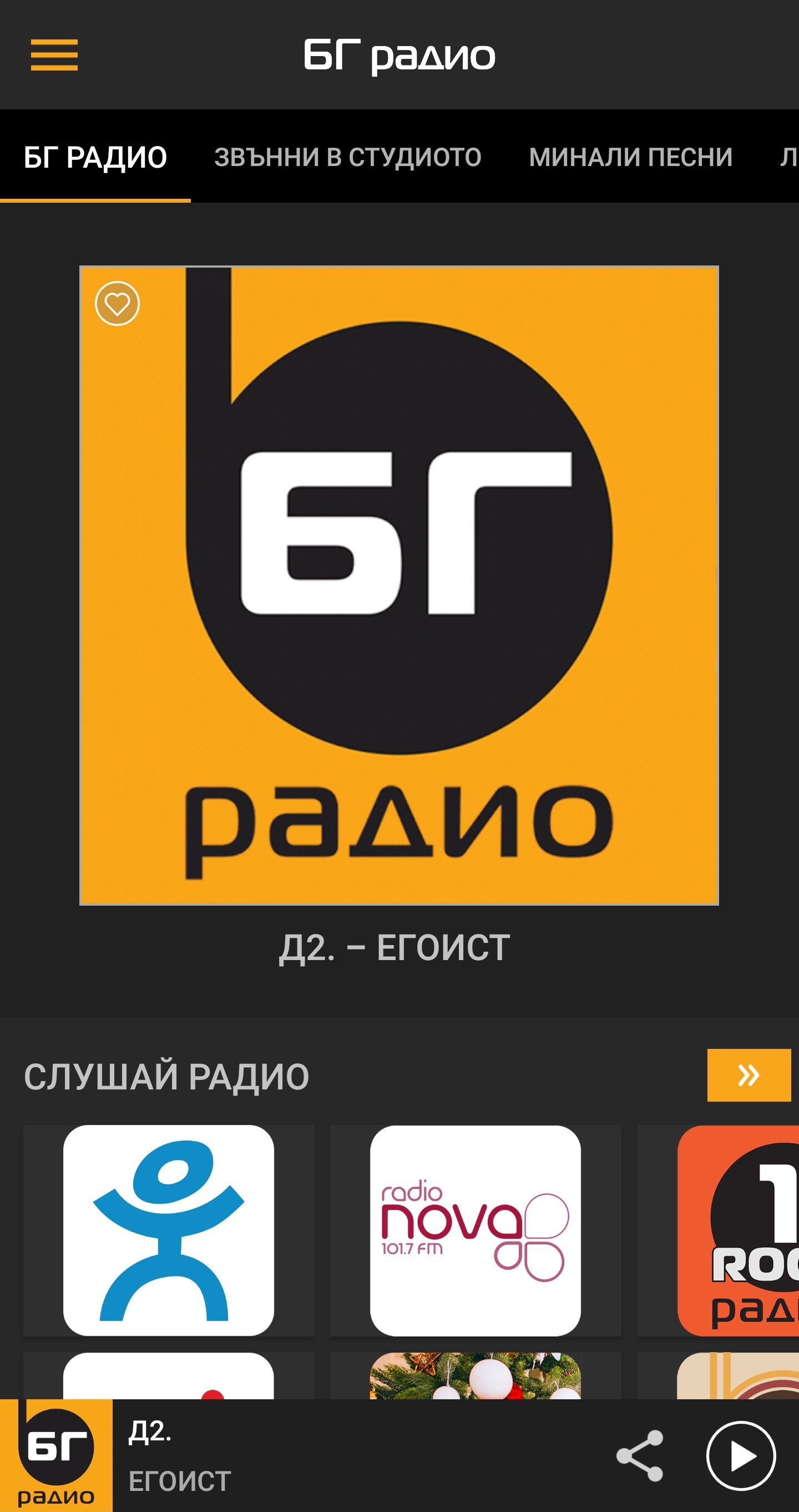 The main application through which you can listen to your favorite radio stations anywhere, completely free. Radio ENERGY, BG RADIO, RADIO 1, RADIO 1 ROCK, VERONICA, RADIO CITY, Radio NOVA, AVTORADIO, Nova News, BG ESTRADA, ENERGY 90's and others. With the application you can contact the studio directly or record a musical greeting.
