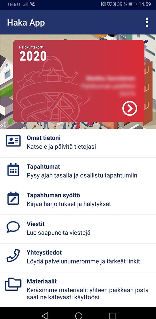 The HAKA - Safety Competence Management Database mobile application maintained by the Finnish Rescue Services Agency is tailored for all HAKA users. Download the mobile app and use it to maintain your own information. Under the license, you can create fire department events and pick participants. The application is connected to the HAKA register in the cloud service in real time.