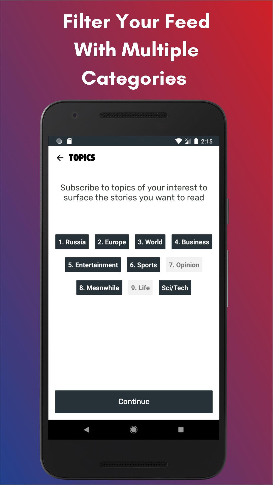 News in ten different categories : Russia, Europe, World, Business, Entertainment, Sports, Opinion, Meanwhile, Life and Sci/Tech. You can turnoff the categories you don't like using the news filter.