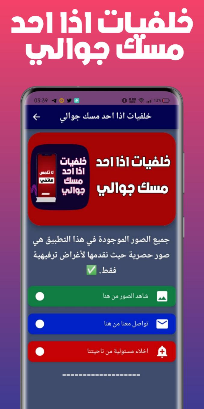 تطبيق خلفيات اذا احد مسك جوالي الذي نقدمه لك اليوم هو احد ابسط تطبيقات الاندرويد الذي يوفر عليك عناء البحث عن خلفيات اذا حدا مسك تلفونك بالعربي وليس ذلك فحسب بل يوفر عليك ايضا عناء البحث عن خلفيات اذا احد مسك تلفونك كما ان تطبيقنا الرائع يتميز بانه عبارة عن مكتبة صور شاملة تضم خلفيات اذا حد مسك جوالك.