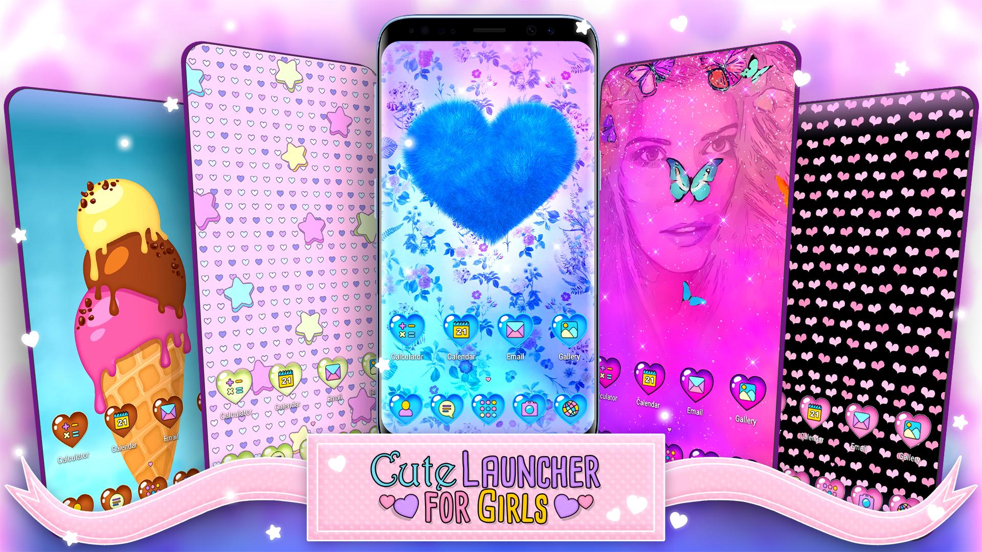 Looking for some different and unique launchers? Than be quick and get this app! Cute Launcher for Girls is the best choice for you. You will be amazed by the offered opportunities - whether you need cute icons for your phone, glitter effect all over your screen, heart theme wallpaper or just a simple and stylish launcher to grace your device's display. If you’re a fan of “cute wallpapers and icons” wait until you see what a collection our new beautiful launcher app has to offer. You will love these heart shaped icons on the “glitter backgrounds for your phone”. Whether it is a heart clock live wallpaper or ice cream or even stars wallpapers and backgrounds that you need, just name it and your new “mobile home screen theme launcher” will make it happen. Do not hesitate. Download now and start using the most charming theme for home screen.