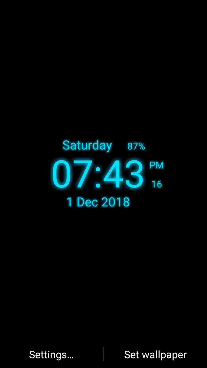 Digital Clock as application or live wallpaper that show displays current time, date, day of week, battery in percentage, AM-PM format seconds and etc.