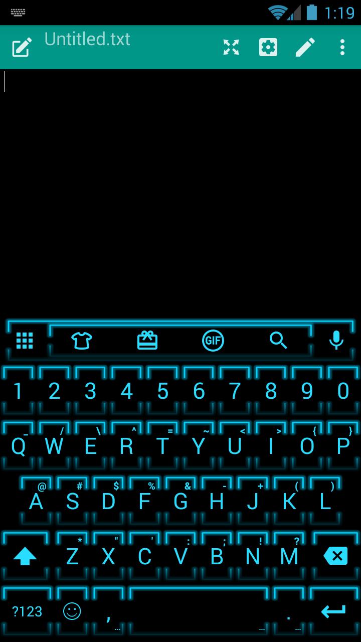 Neon blue theme with black background and glowing azure buttons for Emoji Keyboard (Cute or Premium or KK version) application: please install Emoji Keyboard main program to use this theme.