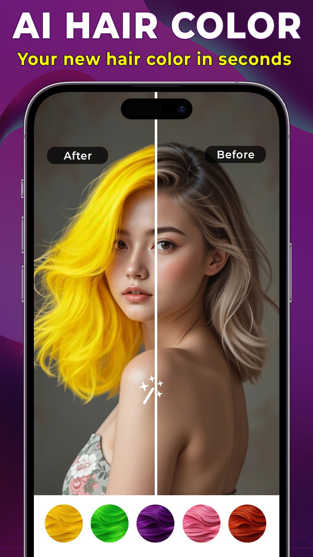 Dye your hair any color and try new hairstyles instantly with AI Hair Color Photo Editor! This virtual hair salon and beauty camera app lets you experiment with realistic hair colors, trendy hairstyles, and flawless skin enhancements—all powered by advanced AI technology.