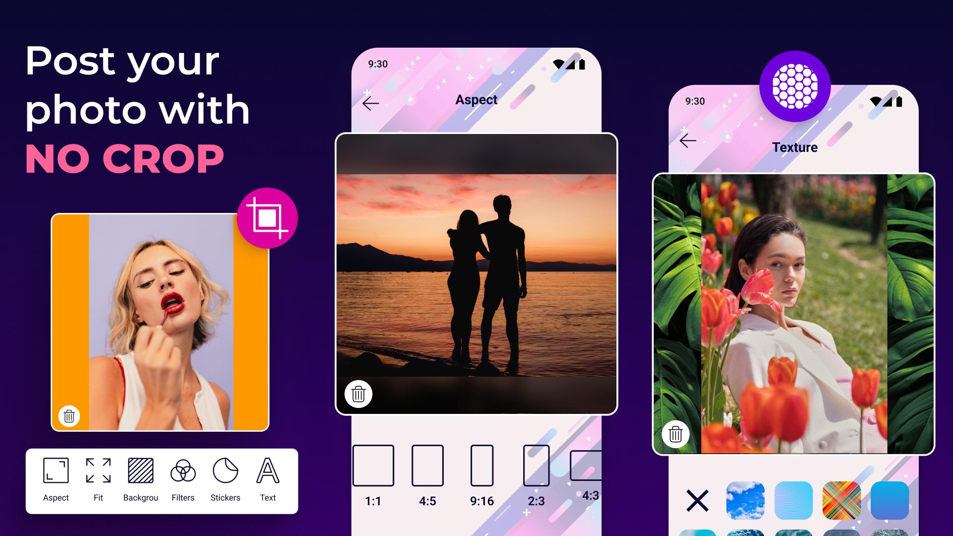 Make your photos eye-catching by adding colorful or blurred background patterns to your square pics. Our square fit app offers vibrant background options that let you express your personality and creativity. Your profile pics will never look dull again with No Crop!