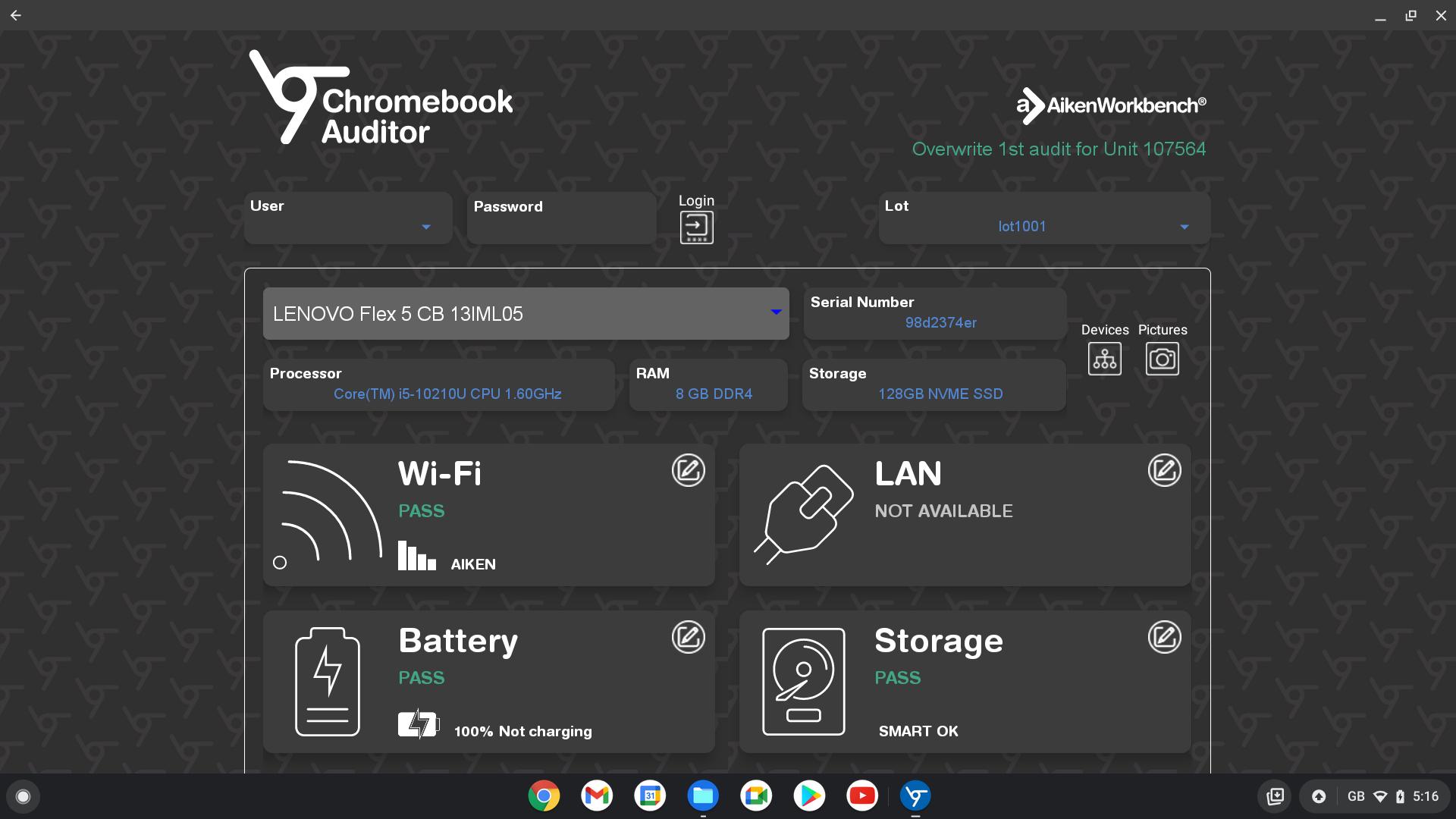 The Aiken Chromebook Auditor forms part of the Aiken Workbench suite of tools for auditing ITAD assets. Aiken Chromebook Auditor permits auditing of Chromebooks. The app needs an Aiken Workbench Server in order to run.