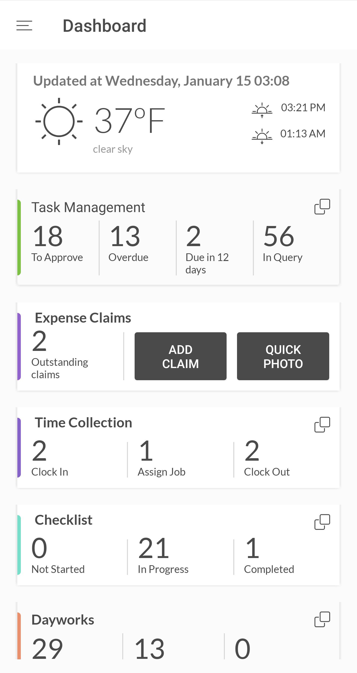 This app contains a wide range of solutions designed to digitise, streamline and connect site-based construction project management and operations processes to the back office. It currently includes Task Management, Time Collection, Issue Management, Checklist, Call-Offs and Expenses.