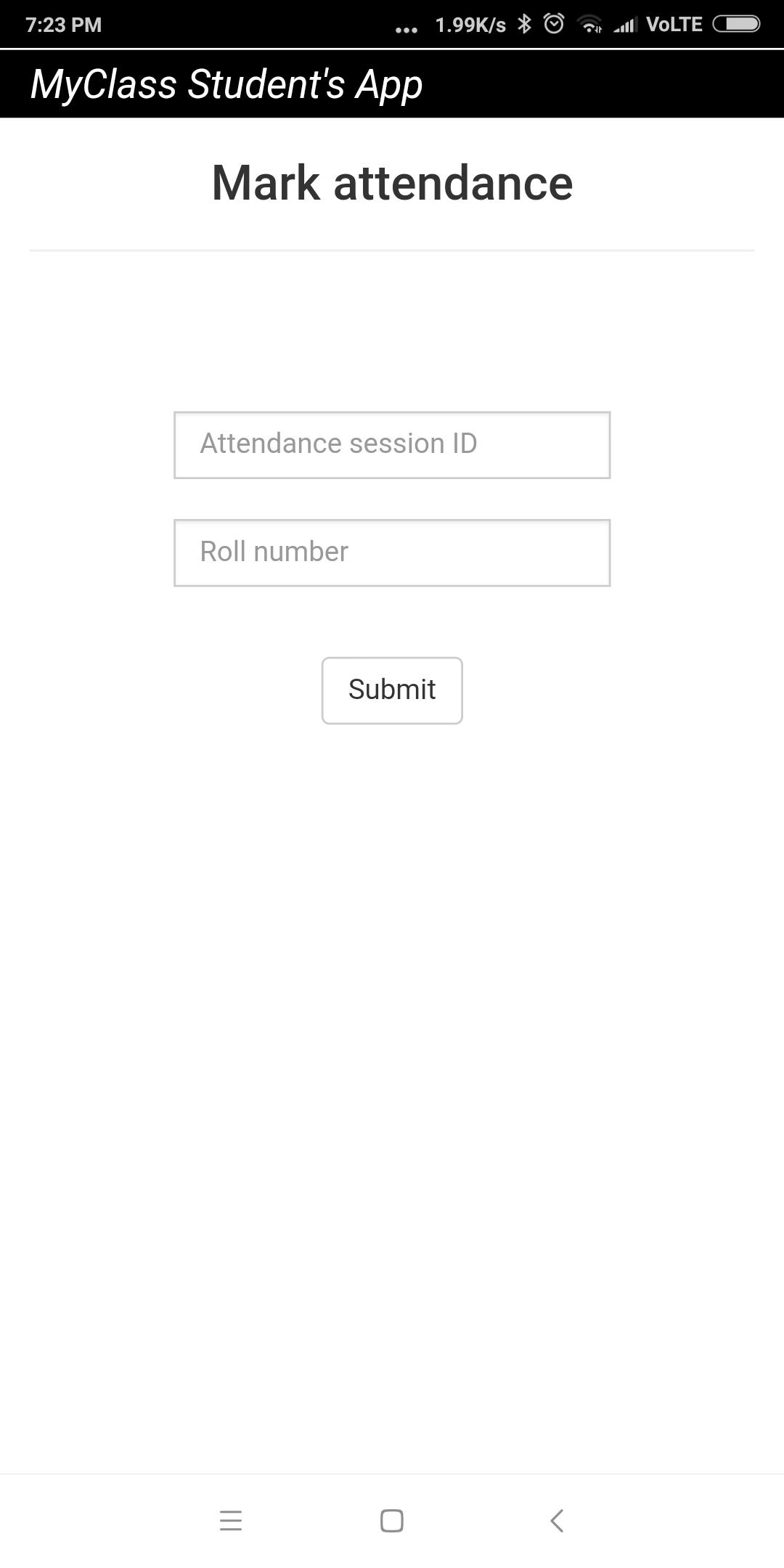 This app must to be used in conjunction with MyClass Attendance teacher's app. Using this app, students or attendees can mark their attendance remotely using their smart phones. The teacher or trainer needs to use MyClass Attendance app and start a remote attendance session. The students or attendees need to enter the attendance session id given by the teacher in order to mark attendance using this app. For the first-time user, the app initiates an enrollment session too. During enrollment, the app prompts user to enter details like name, phone no, email id and photo which get saved in teacher or trainer's app as records.