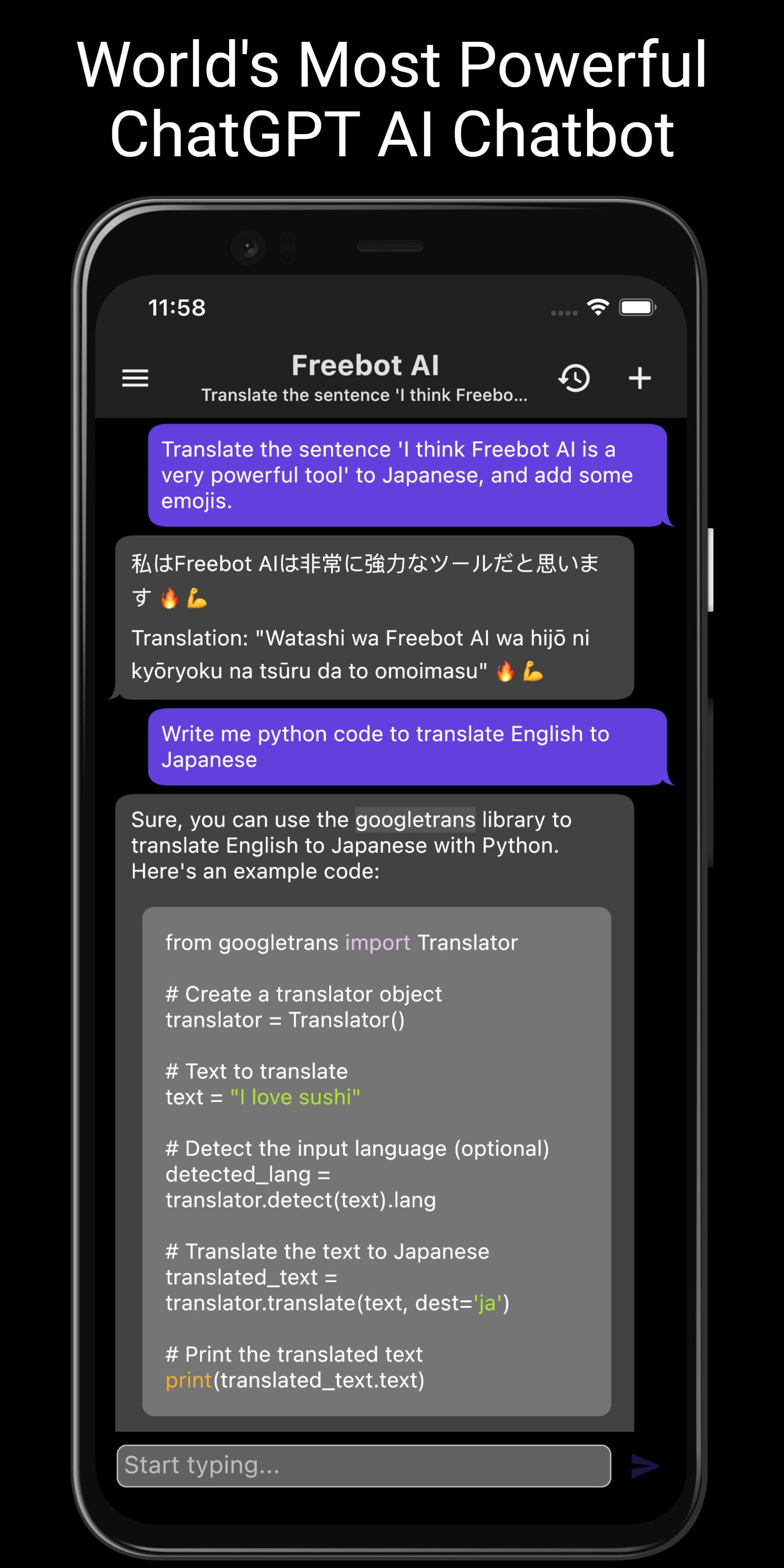 Freebot AI Chat offers free daily access to the world's most powerful AI Language Model, ChatGPT & GPT-3.5.