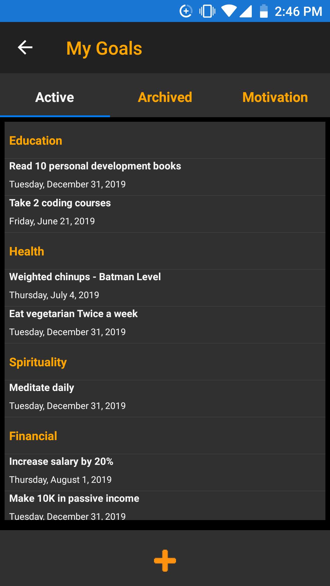 Progressive Goals provides a centralized place for all your goals (that can be anything from hitting fitness PRs to mediations habits), grouped by the areas you define (Fitness, Money, Relationships, Spirituality), and you can access them from any mobile or desktop device since the data is safely stored in the cloud using Google authentication.