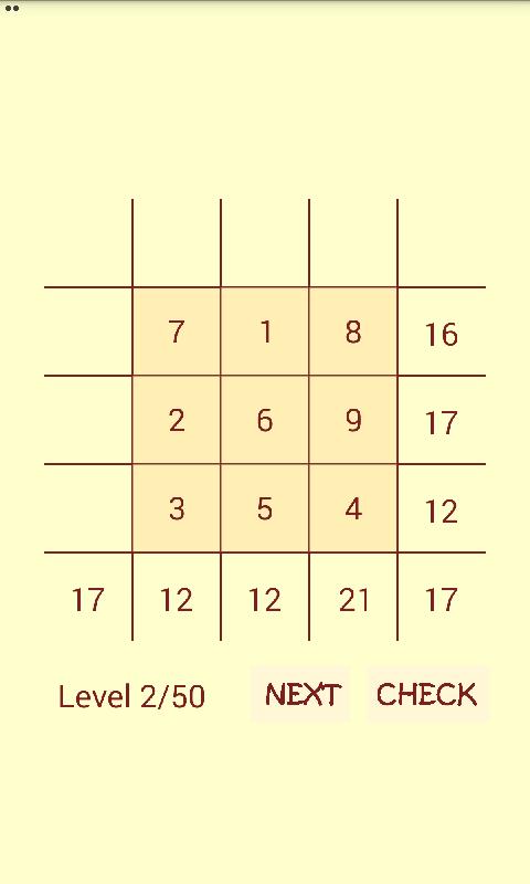 The game that combines math magic square numbers and sliding puzzle game. Magic square numbers itself is a square arrangement of integer numbers where the additional value horizontally, down, and diagonally is have same amount, and for further information about magic square you can read in the literature. The gameplay is to just find an arrangement of numbers that produce the same amount and provide the correct arrangement pattern, that signed by changing of the color of background. And you must tap the check button to get how many score you get it. Let Try and Have Fun!