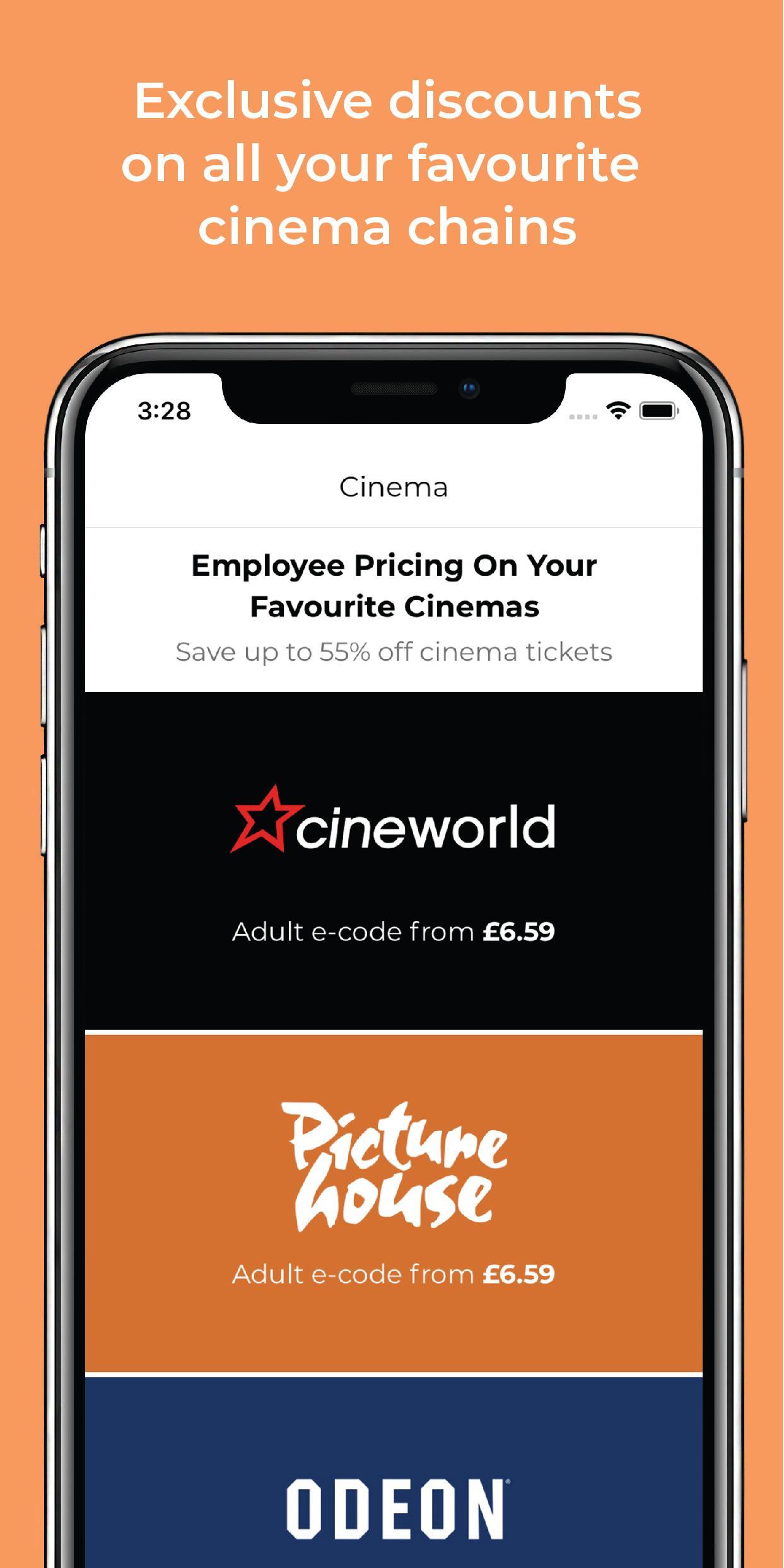 The Perks at Work Cinema App app gives you instant access to e-codes for major cinema chains across the UK as a Perks at Work member. Buy your e-code through the app at our exclusive employee pricing, saving up to 55% on your cinema tickets.