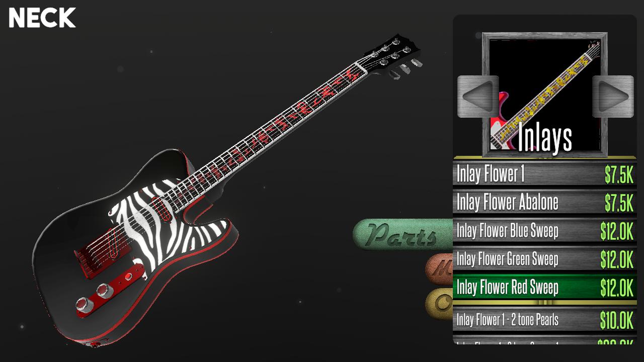 Unlock tons of custom parts to make unique guitars. Millions of possible guitars, 500+ unlockable parts and materials for guitars. Build requested guitars, build and sell you own guitars, and manage your shop to earn money and unlock new parts.