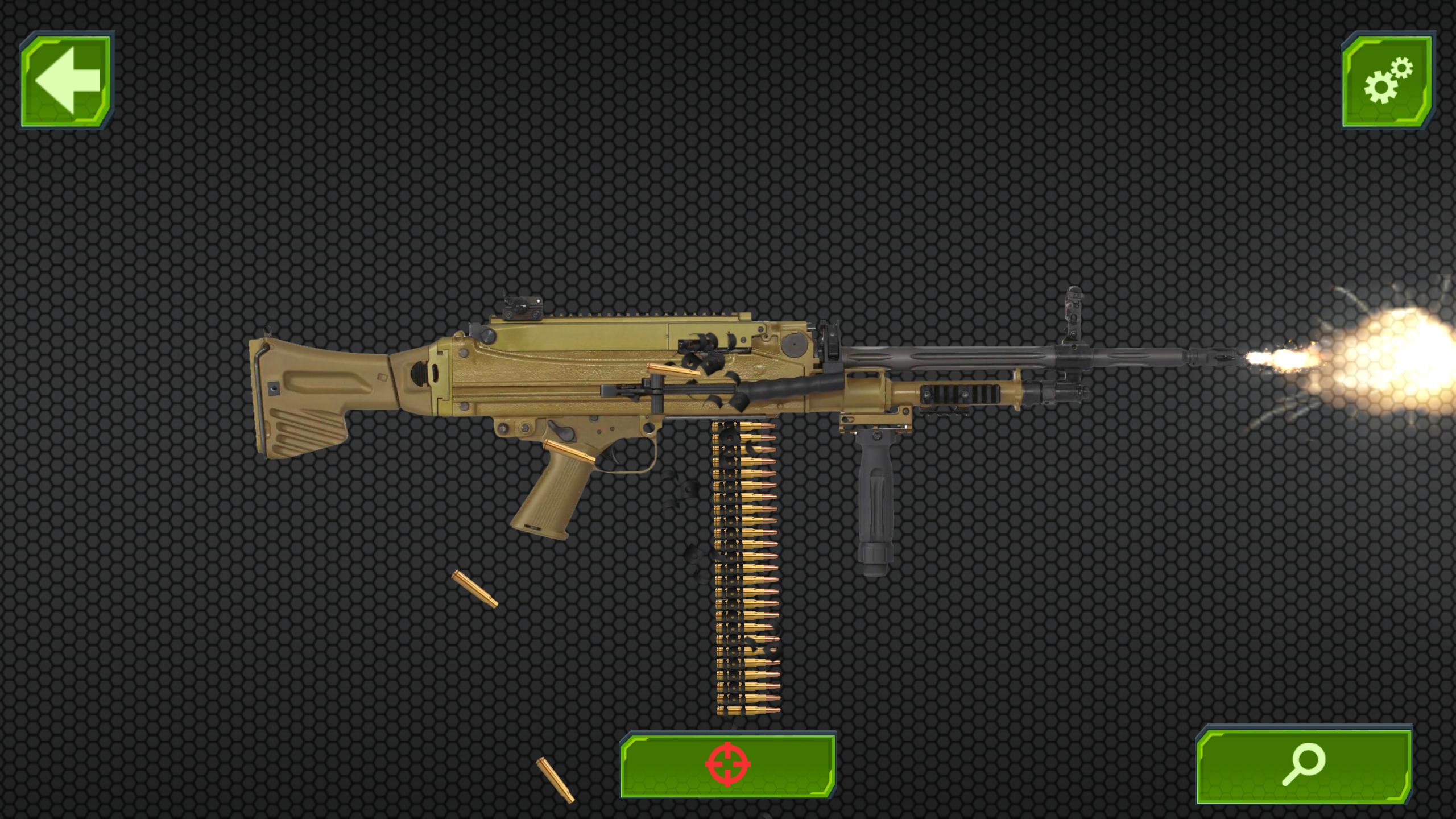 App contain light and medium machine guns, with muzzle flash, cartridge belts, smoke and sound effects. To play you only need to choose a weapon, set mode to burst, semi-auto or full-auto, pull the trigger and you'll feel realistic sound and shots. You can also set options to slow and guns will shot in slow motion. If you run out of bullets just tap on magazine or click on reload button and ammunition belt will reload automatically.