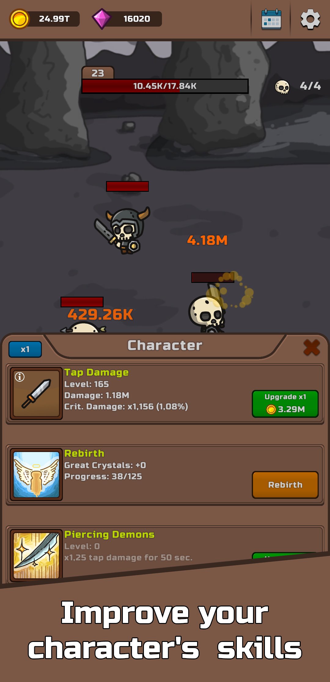 Tap Dungeon: RPG Idle Clicker - an endless adventure game in which you have to free dungeons from armies of enemies. Earn gold, get resources, improve your character's skills and spells. Collect a collection of ancient artifacts and discover all the great heroes who will help you win this difficult battle. In this tap simulator you will have to Fight monsters and get great crystals, be reborn and exchange them for ancient artifacts that will increase the damage of your character and your heroes.