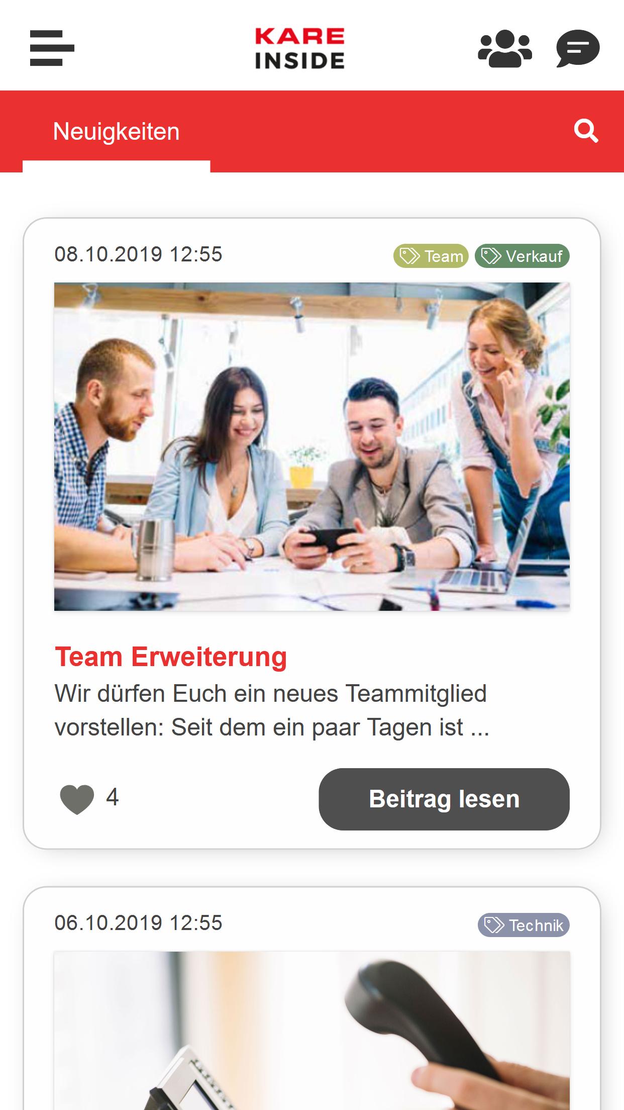 With the KARE INSIDE employee app you receive the latest news and information from the KARE world. KARE INSIDE is easy to use, you can chat with your colleagues, post on the pin board and much more.