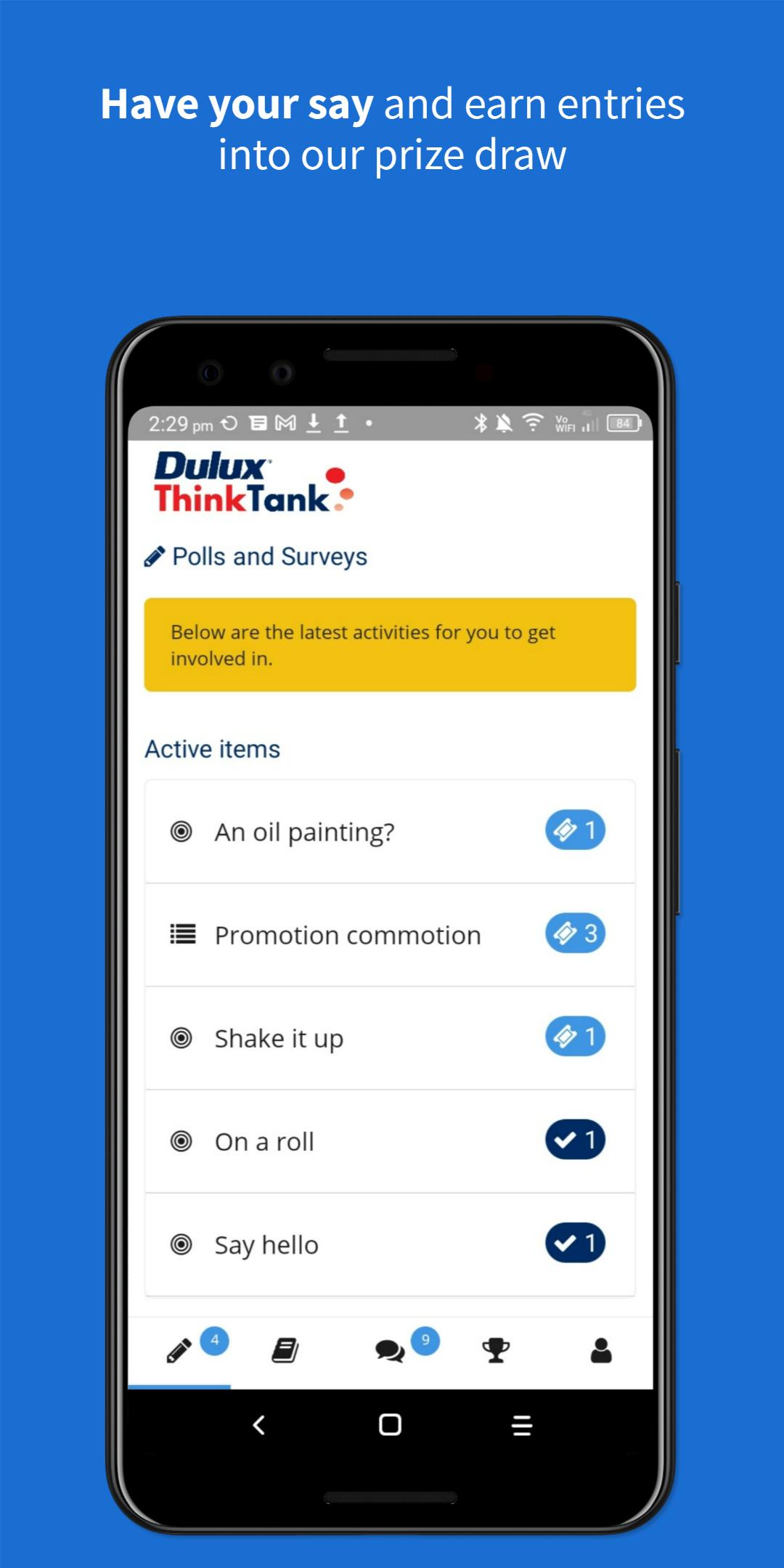 Dulux will share upcoming ideas, products and services we are working on to get your feedback, and to help shape a better offering for you and your business. Every week we have new and interesting activities including surveys, polls, and discussion topics that you can take part in. You can participate as much or as little as you like, but with $1,000 in prizes every month, the more you take part, the greater your chance of winning a prize.