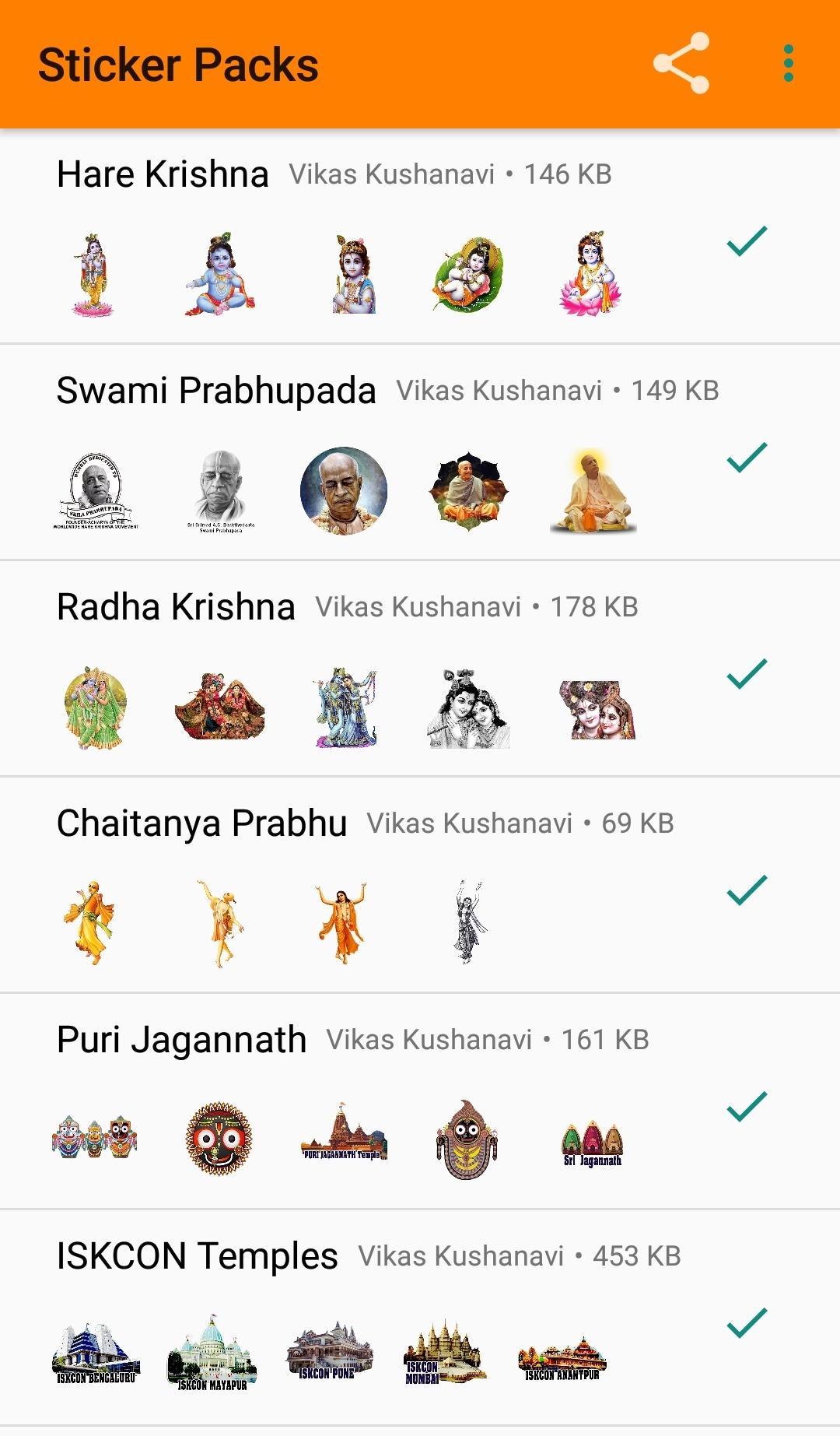 Add sticker packs fro whatsapp include various categories stickers like Hare Krishna, A.C. Bhaktivedanta Swami Prabhupada, Radha Krishna and Chant Hare Krishna. Almost all kind of stickers are added in the single app. Stay tuned and keep checking for future updates which may includes many more stickers.