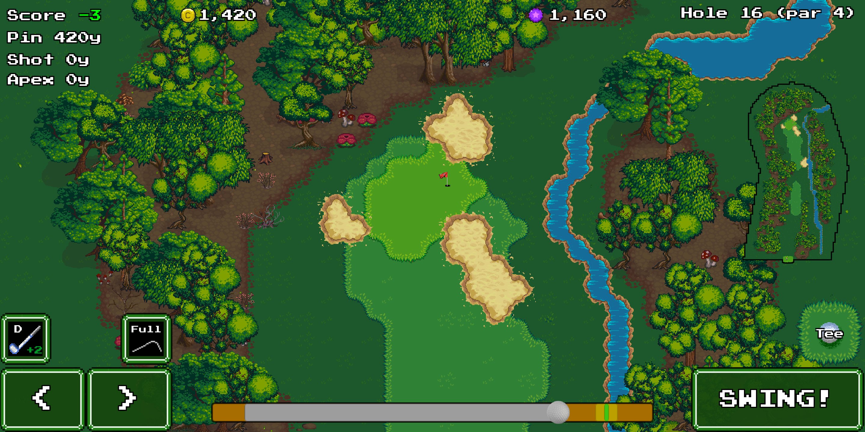 16-bit style 2D golf game with authentic golf gameplay, procedurally generated holes and RPG elements. Create a character, then use the on-screen controls to play golf. The swing meter is a classic 3 click swing - first to start the backswing - a second click to determine power, then a third click as close to the green "snap" point as possible to hit a straight shot. Aim with the black pointer. Earn gold and experience to buy new equipment and increase your golfer's skill. Bonus gold and experience is earned for good shots and good scores.