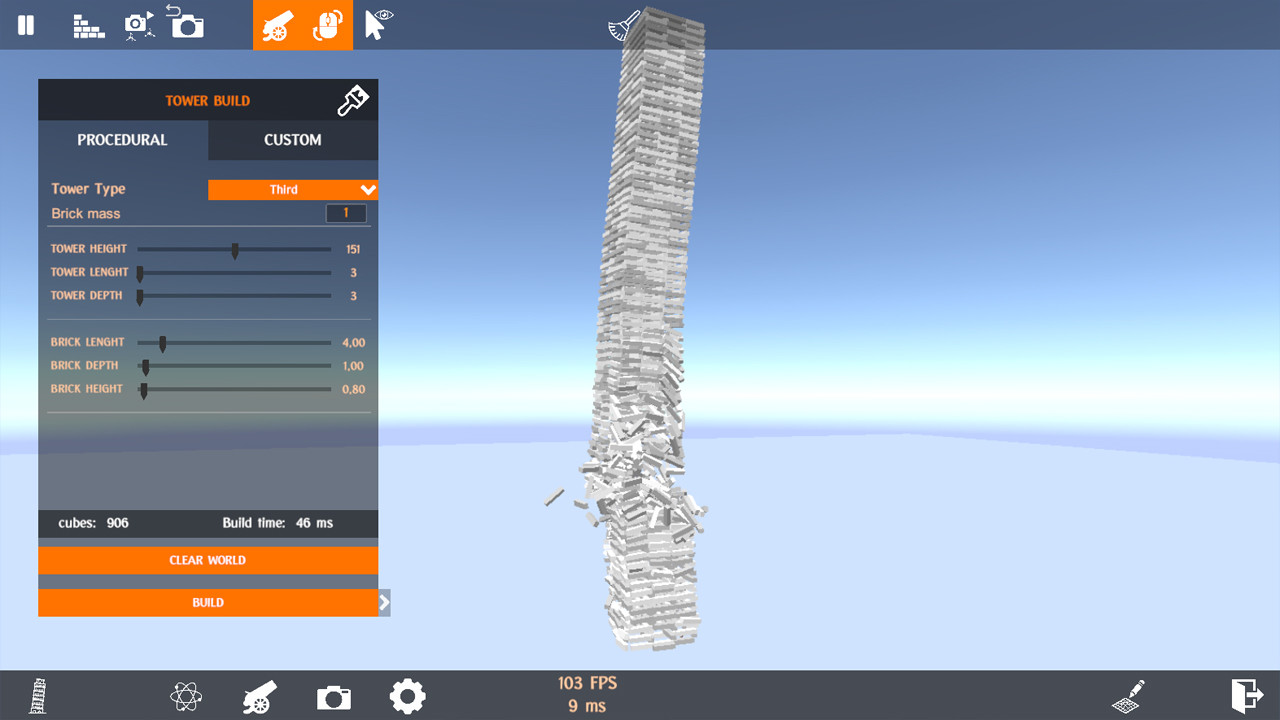 Game allows you to build many kinds of towers from a variety of bricks and experience their dynamic destruction physics in a sandbox environment.
