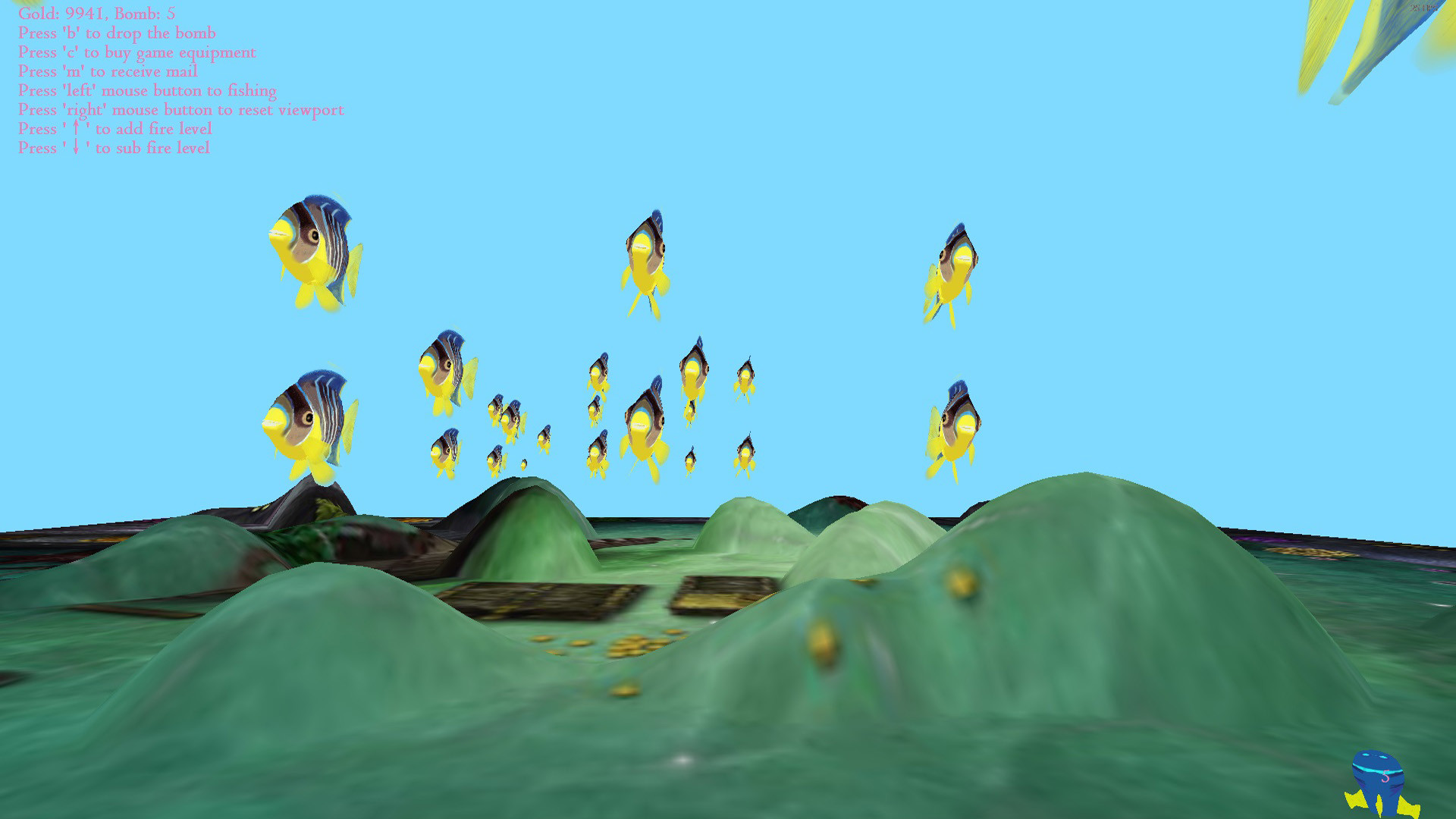 The game uses the first vision to control the turret to launch artillery shells and bombs to fish.