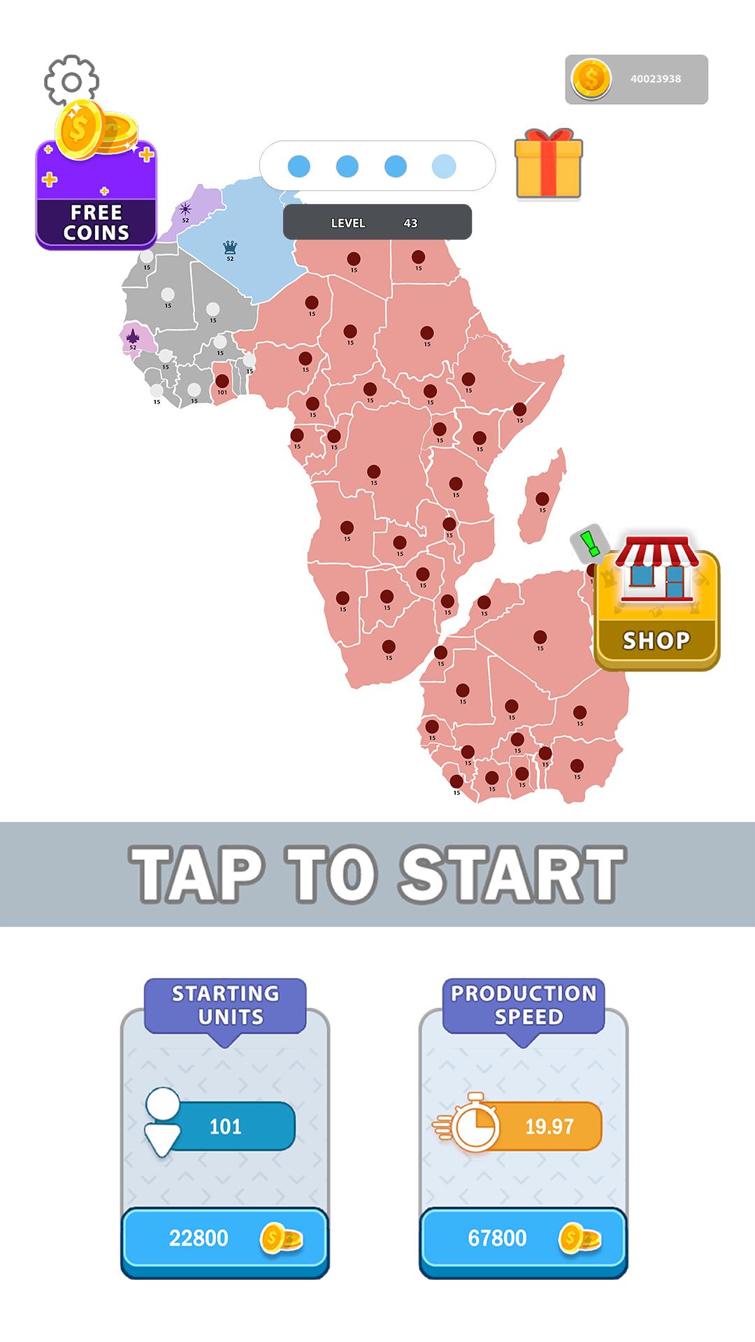 You can pick your territory before playing the game and then start attacking on other territories. We have designed a variety of maps for your enjoyment so that you can play as much as you can. As you play more and more, the game become more challenging for you as other territories will also start attacking on you. But you can avail a chance of air attack by watching an ad, with this help you will be able to dominate all other powerful regions of the game in a single attack.