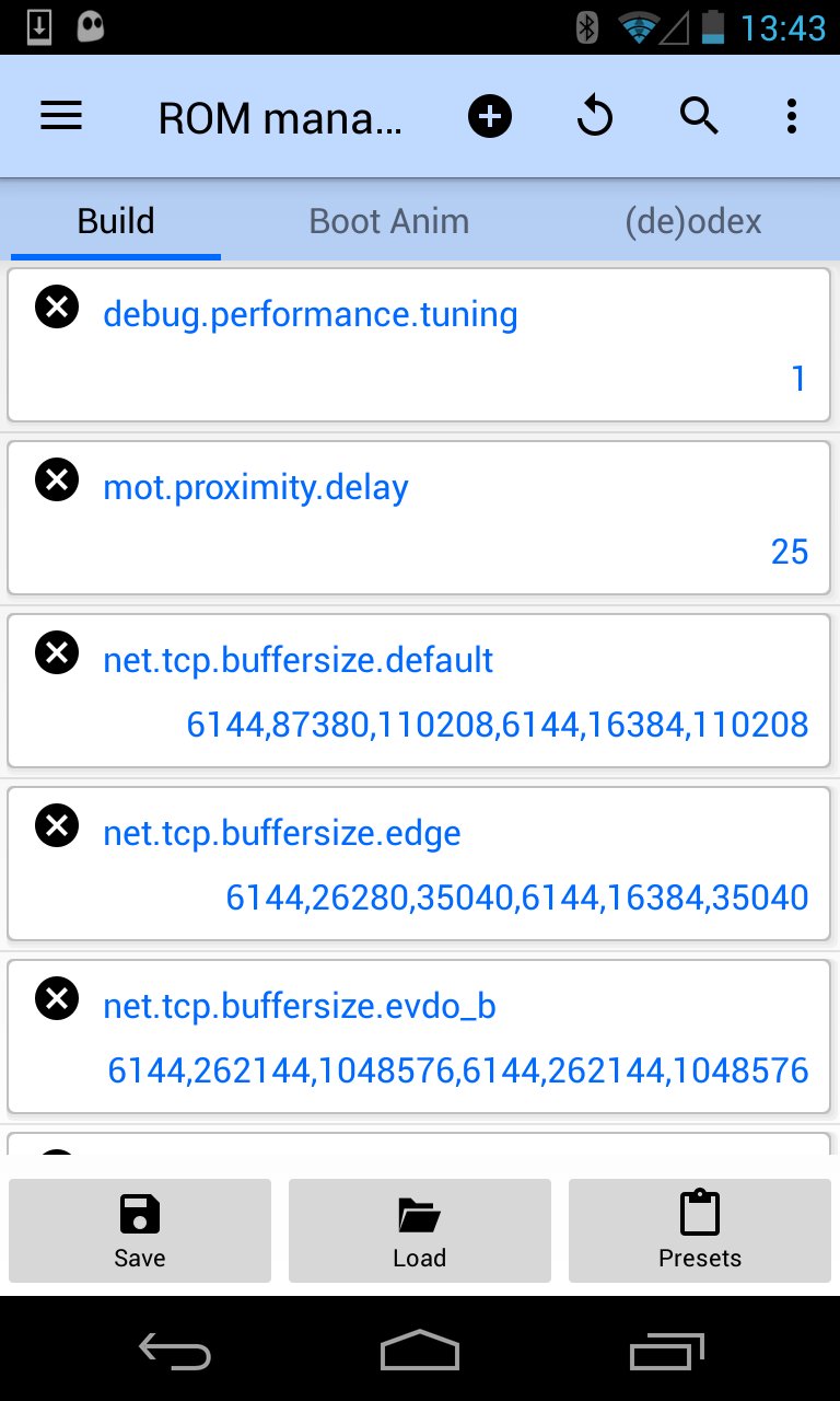 A simple ROM manager allowing to edit build.prop, change default font, boot animation and even odex/deodex your firmware (Android 9 or below). Will not work without root.
