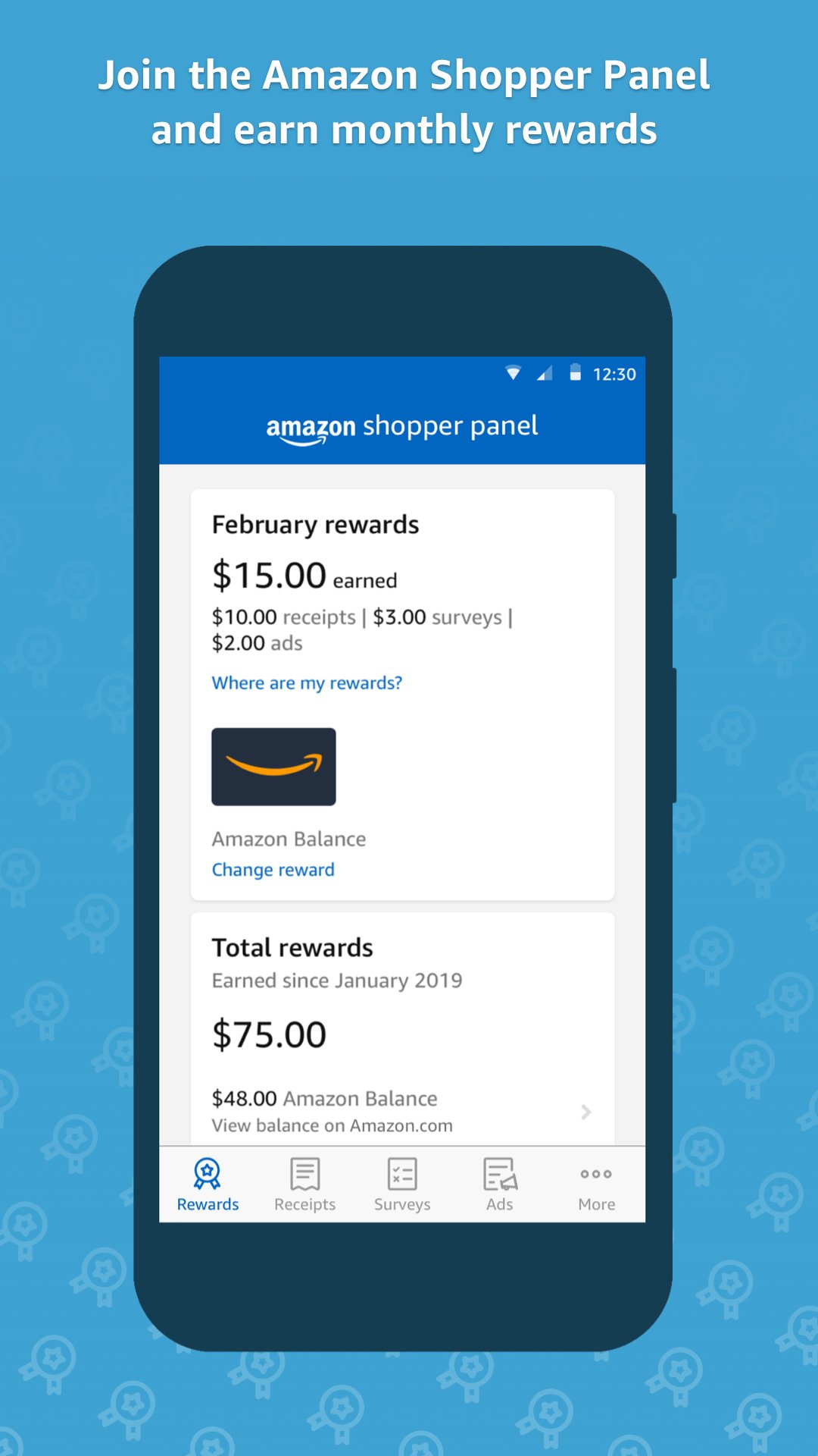Earning rewards is easy. Simply upload eligible receipts every month by using the Amazon Shopper Panel app to take pictures of paper receipts or by forwarding email receipts to receipts@panel.amazon.com and you’ll earn up to $10 towards either an Amazon Balance or a charitable donation. You’ll earn additional rewards each month for every survey you complete or if you enable ad verification. Space is limited and you may only be eligible to participate in certain parts of the program. You can check if you are eligible by tapping on the tabs for Receipts, Surveys, and Ads in the app.