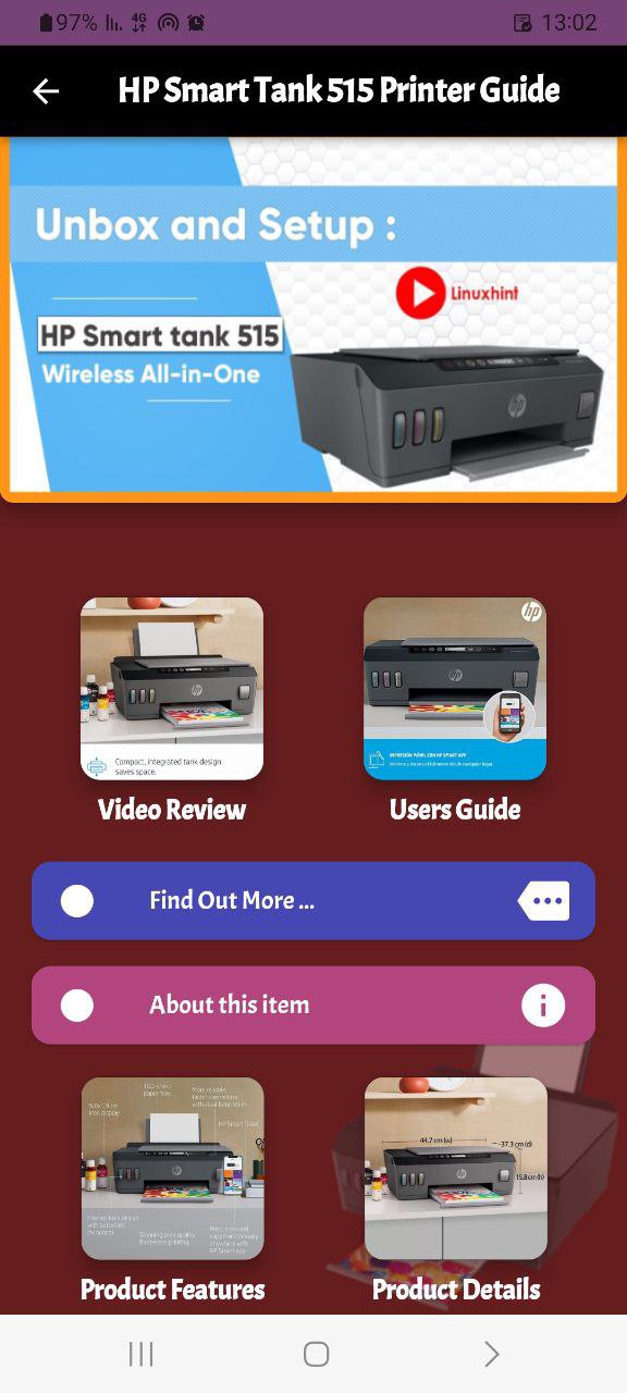 The HP Smart Tank 515 Printer Guide application contains many information and features of the HP Smart Tank 515 Printer that you can get clearly and easily.