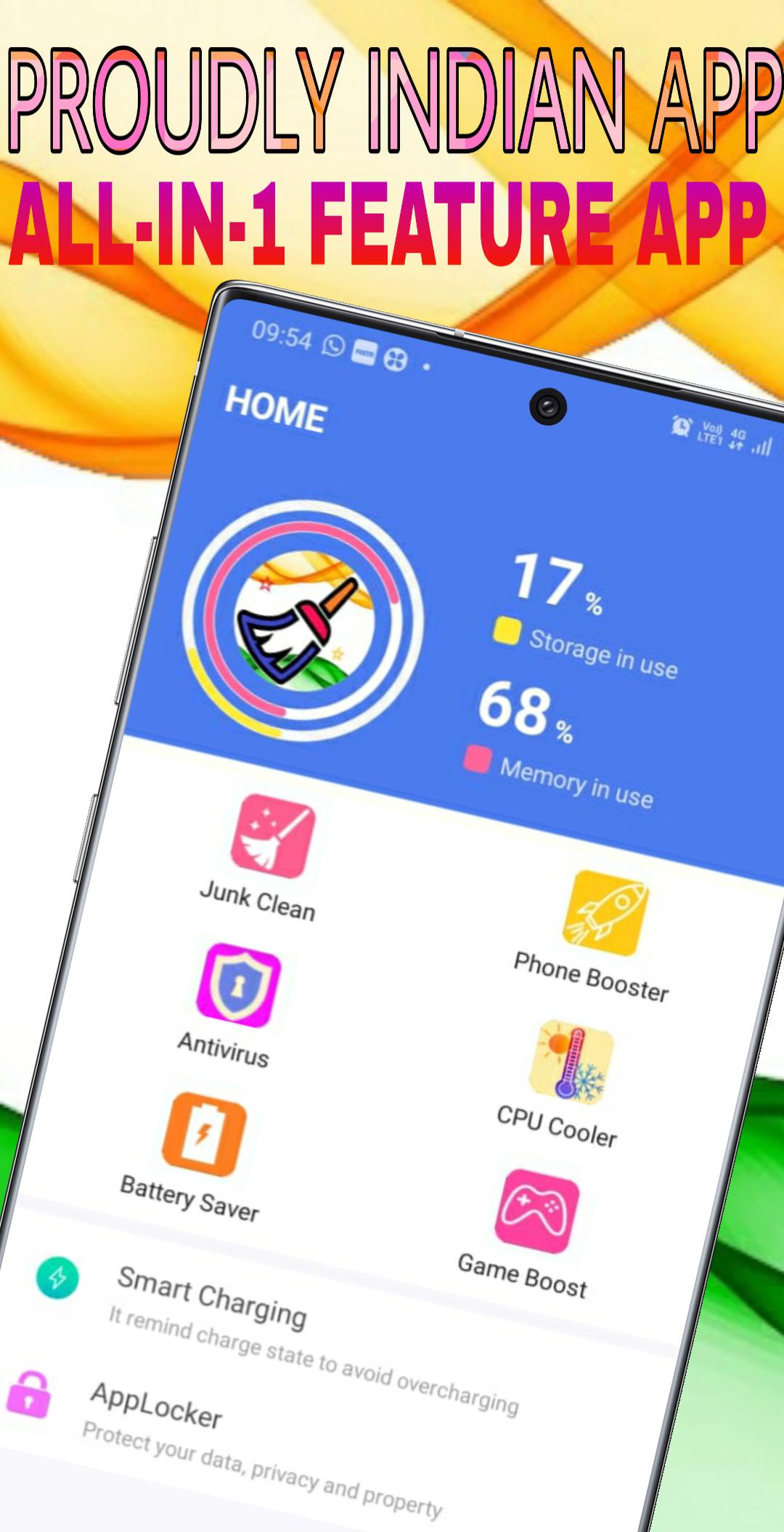 INDIAN CLEANER ANTIVIRUS = Junk Cleaner + Antivirus + Phone Booster + Applock + CPU Cooler + Battery Saver + Duplicate File Remover + Notification Manager + Game Booster + Smart Charging + App Manager