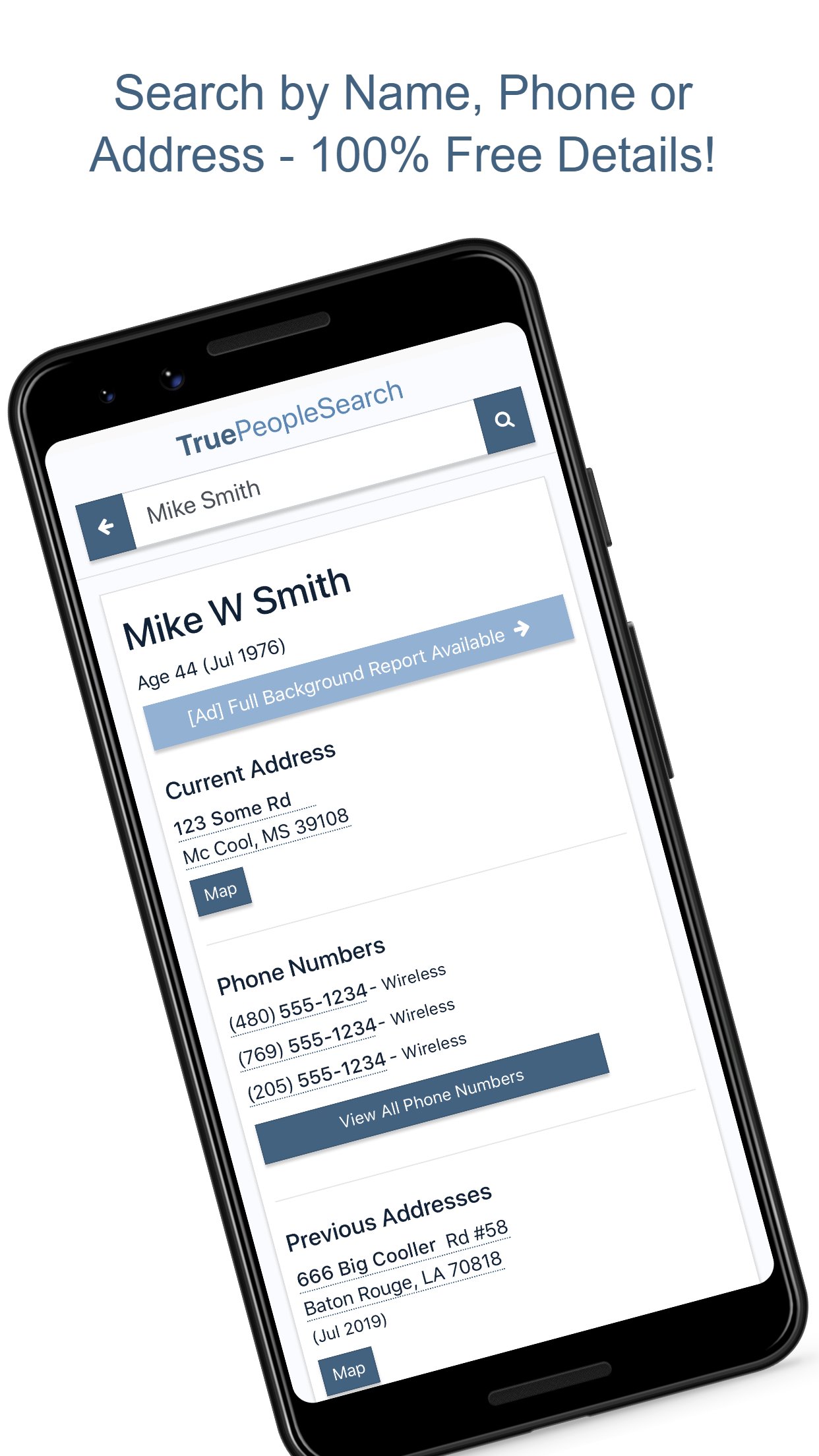 Millions of people use True People Search every month to find lost friends & loved ones. With comprehensive data on nearly every US adult, our free people finder is as deep, current and accurate as any of the paid people search engines. Do a free reverse phone lookup, free people search or free address lookup and get a free background check instantly.