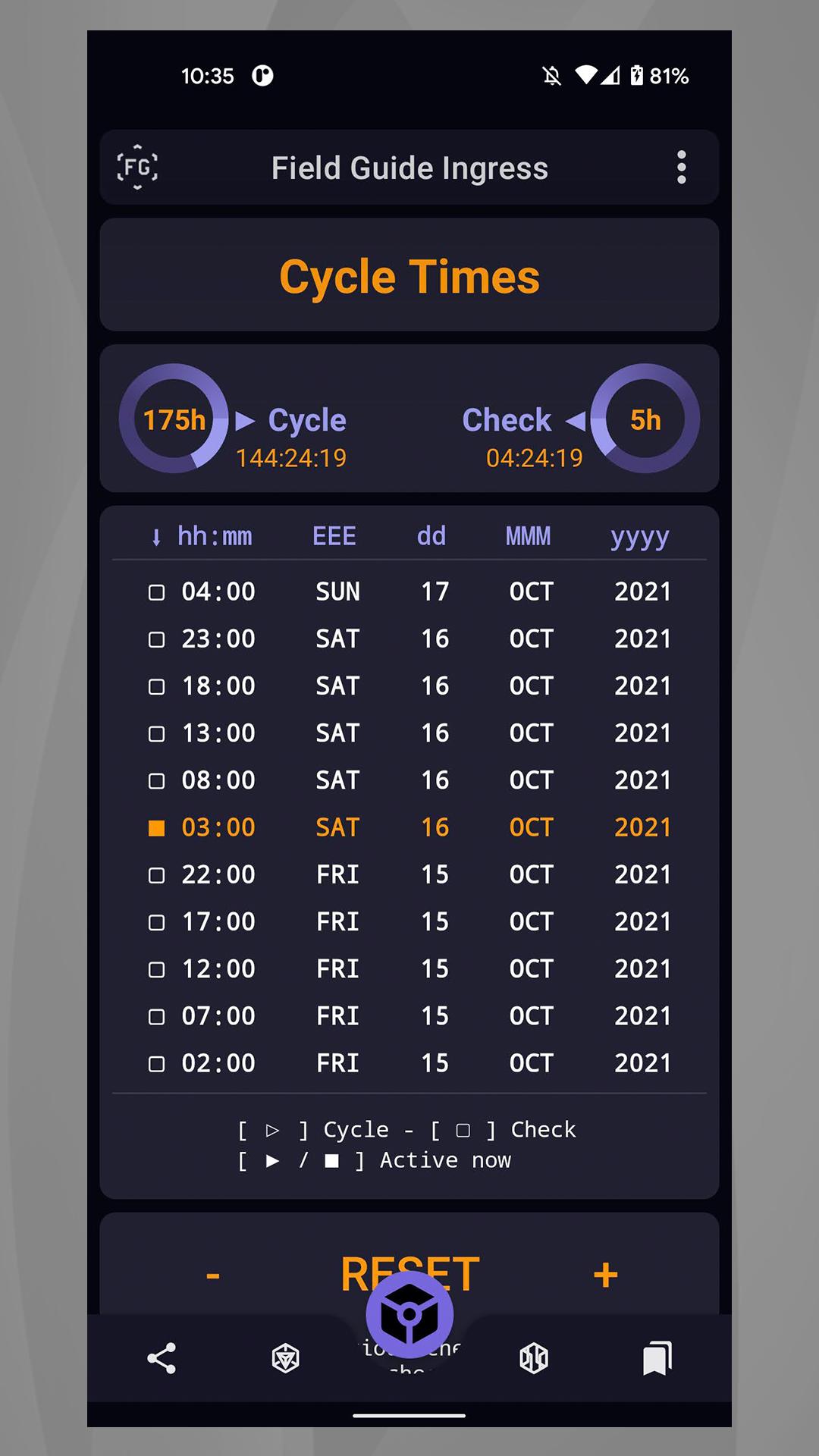 Field Guide for INGRESS game. Where you can check the times of Cycles, Checks, Link Distances, Access Levels, Items....
