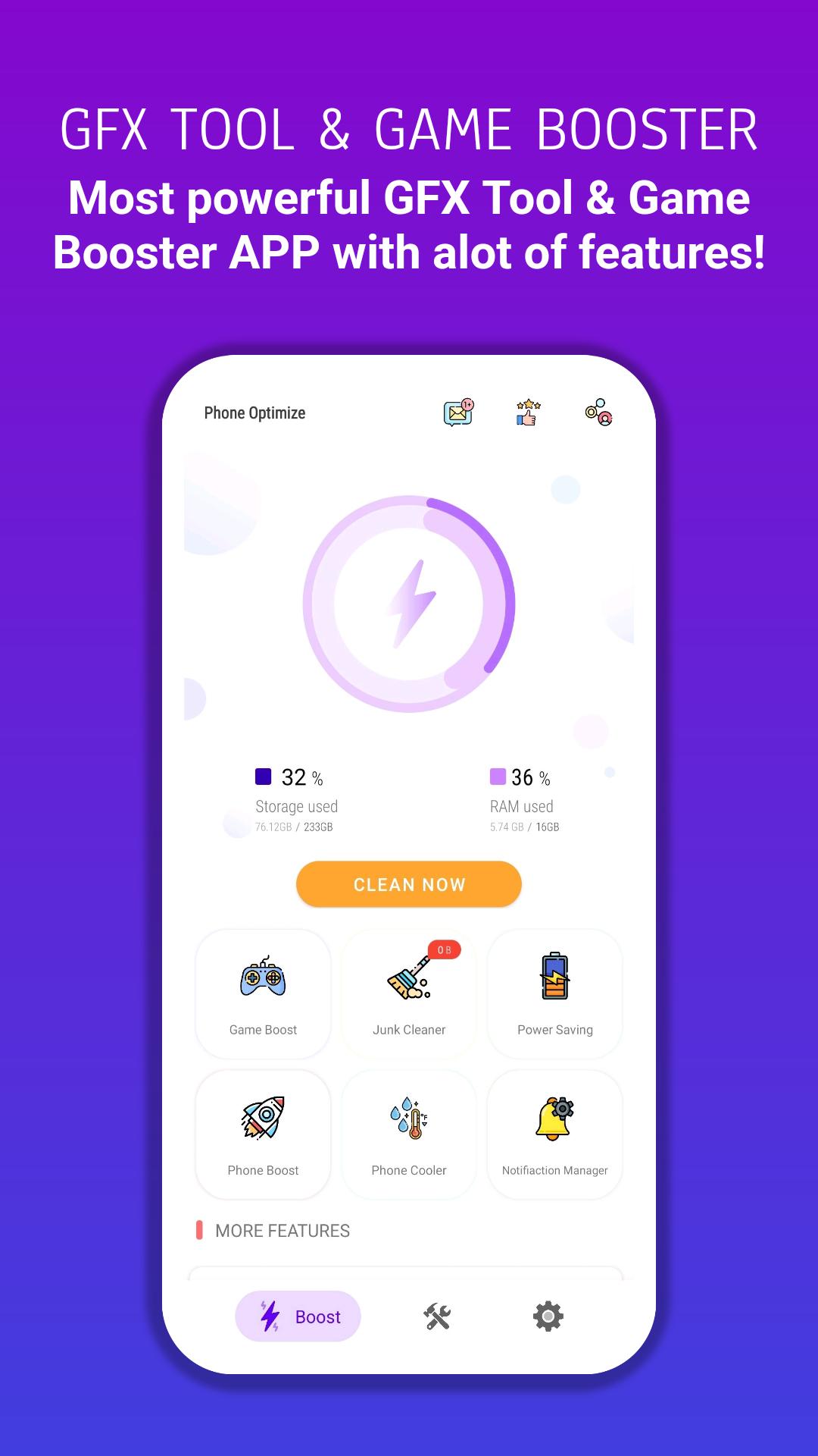 GFX Tool and Phone Optimize: is a launcher and boosting tool for FPS games where you can fully customize the game graphics according to your desires for a smooth gaming experience, cleaning and boosting for Android, which has the functions of junk cleaner, power saving, memory booster, game booster, and CPU cooler Central, notification cleaner, and app manager. Do you lack space for new apps and photos? Just clean the apps cache and junk files, and boost your phone in one tap.