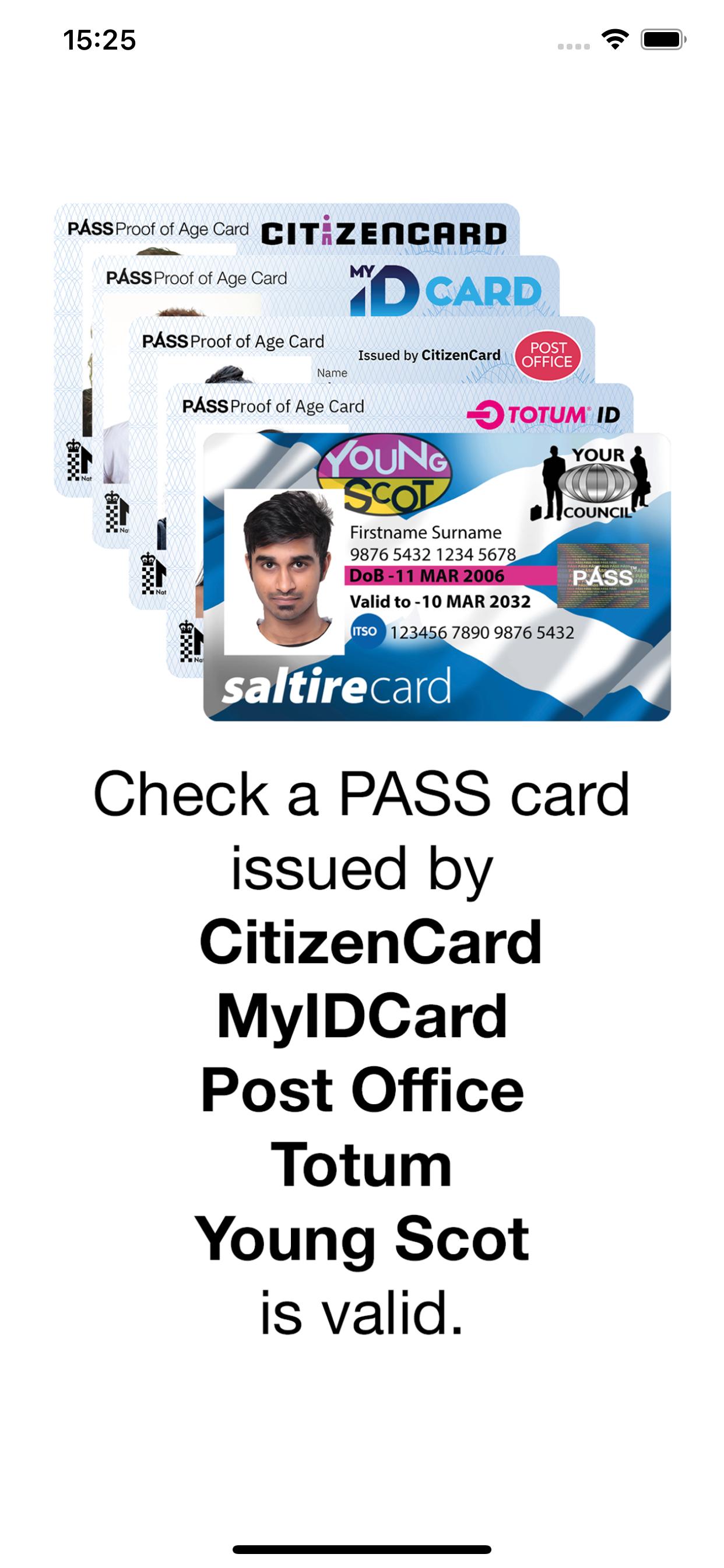 The app only works for physical PASS cards that are nationally-available: CitizenCard, MyIDCard, Post Office, Totum NUS and Young Scot PASS cards. This app cannot validate local or expired cards.