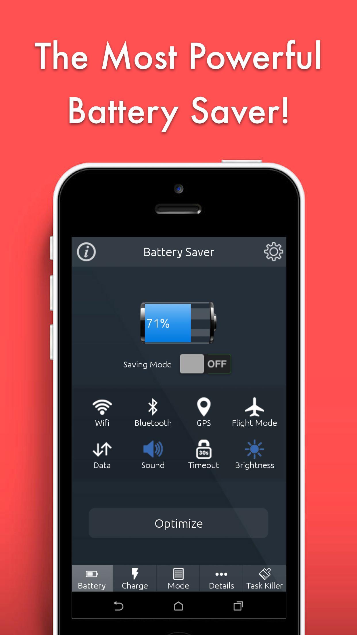 Being a battery saving apps, Premium Battery Saver gives you the freedom in choosing among different energy saving modes. The two preset mode (Saving Mode and Sleep Mode) help you quickly optimize the power consumption of your devices, while Customized Mode allows a much further flexibility in choosing the right settings (such as Wifi, Volume, Brightness, Data, Bluetooth …), which best suit to your needs.