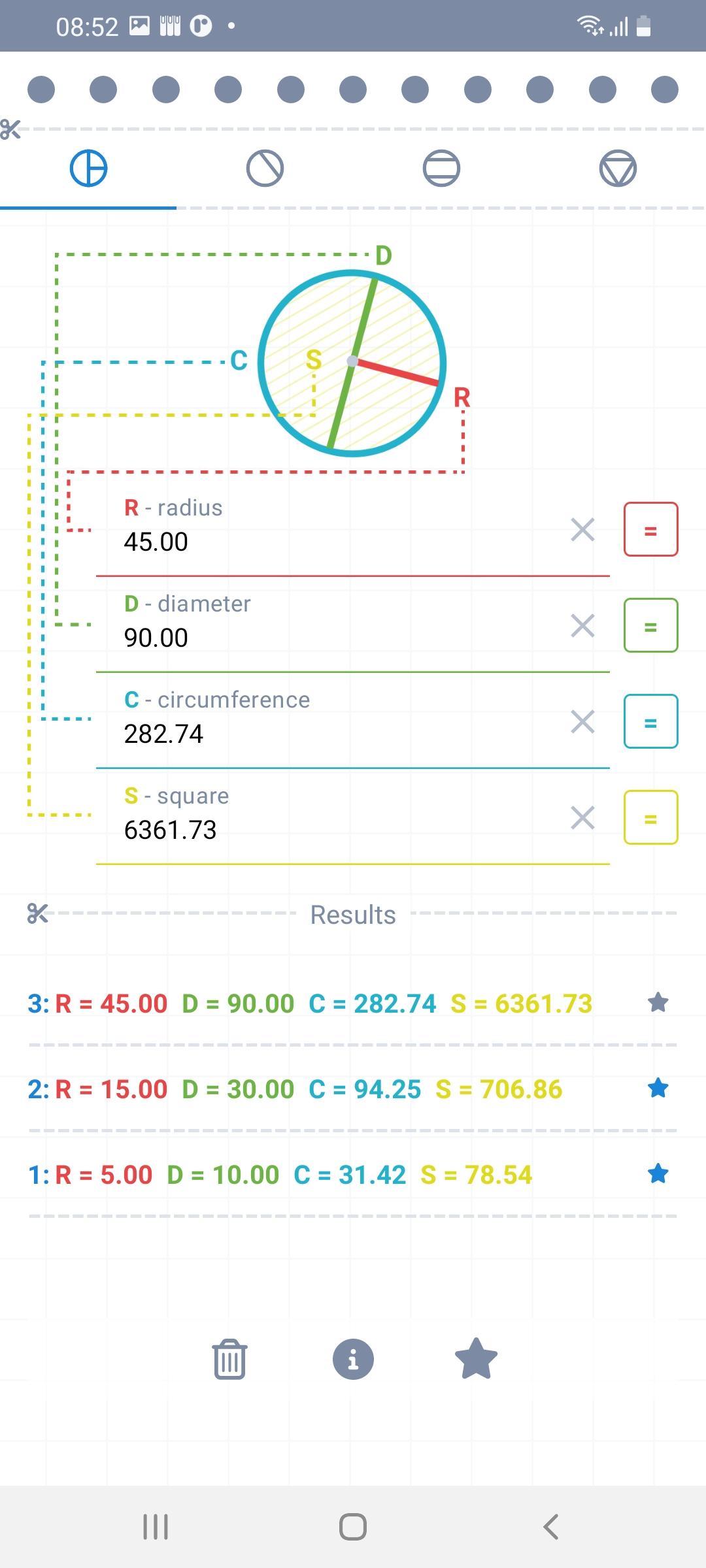 - calculates circle radius, diameter, circumference, area, chorda length, arc length, segment height and area, sector area